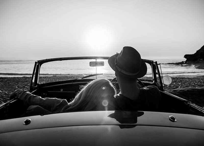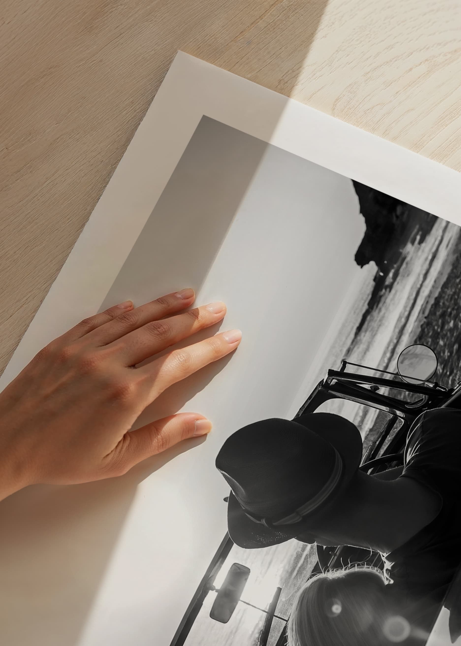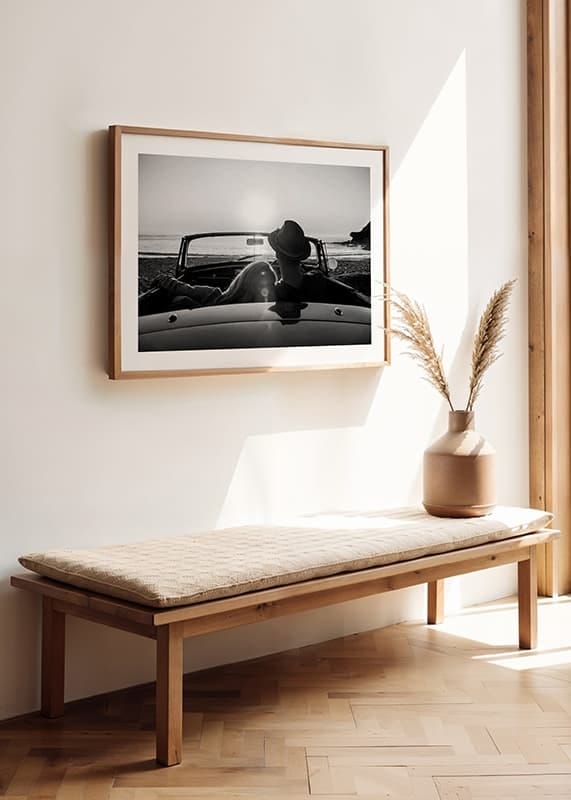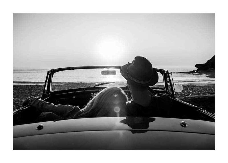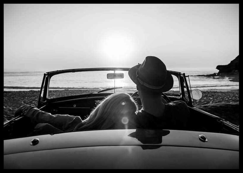 Två personer sitter tillsammans i en vintage-cabriolet med ryggen mot kameran och blickar ut mot en solnedgång över havet. Solens låga ljus ger motivet mjuka kontraster i svartvitt. Klassiska linjer och strandmiljö skapar en tidlös känsla som gör denna poster till ett lugnt inslag i vardagsrum eller sovrum.