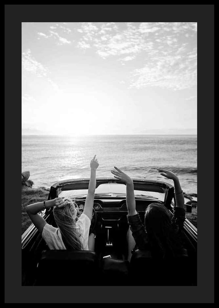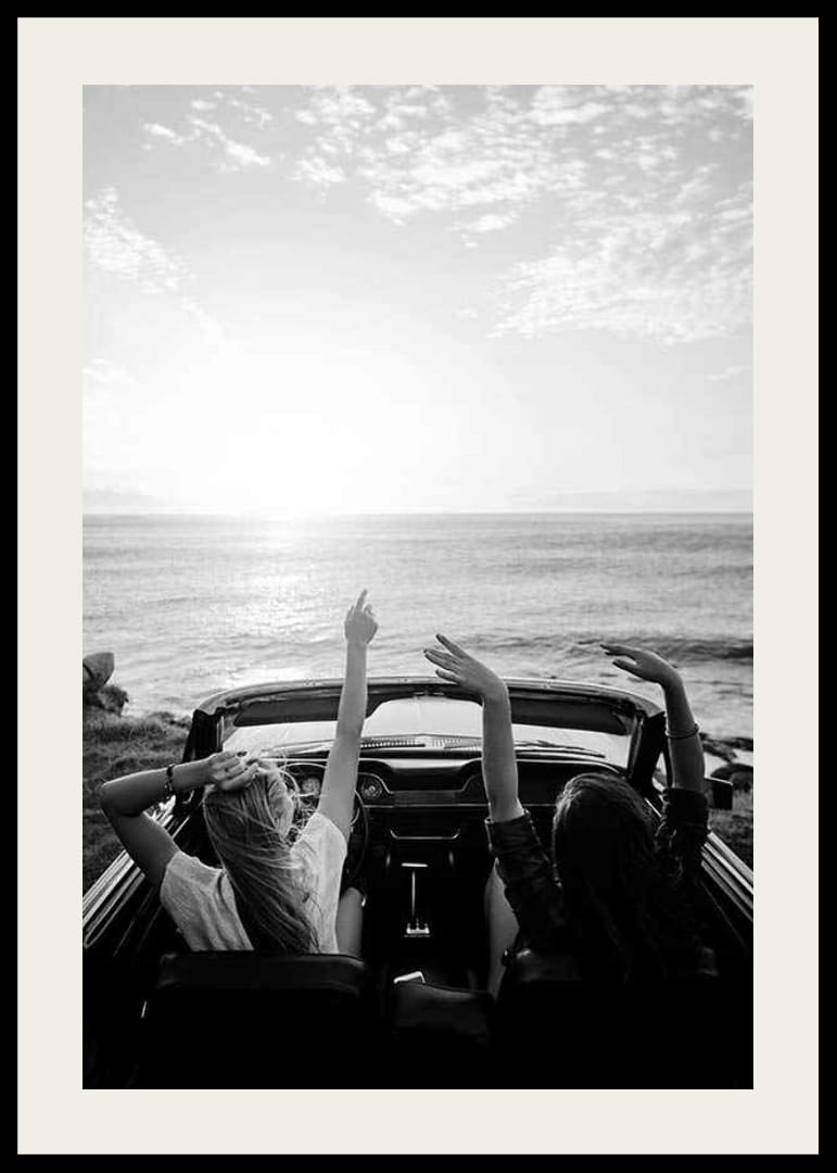 Två unga kvinnor sitter i en cabriolet parkerad vid kusten och blickar mot ett öppet hav medan solen står lågt på himlen. Motivet präglas av avslappnade poser och spontana rörelser, vilket fångas i en klassisk svartvit ton. Denna poster passar i sociala ytor där en känsla av frihet och sommarminnen uppskattas.