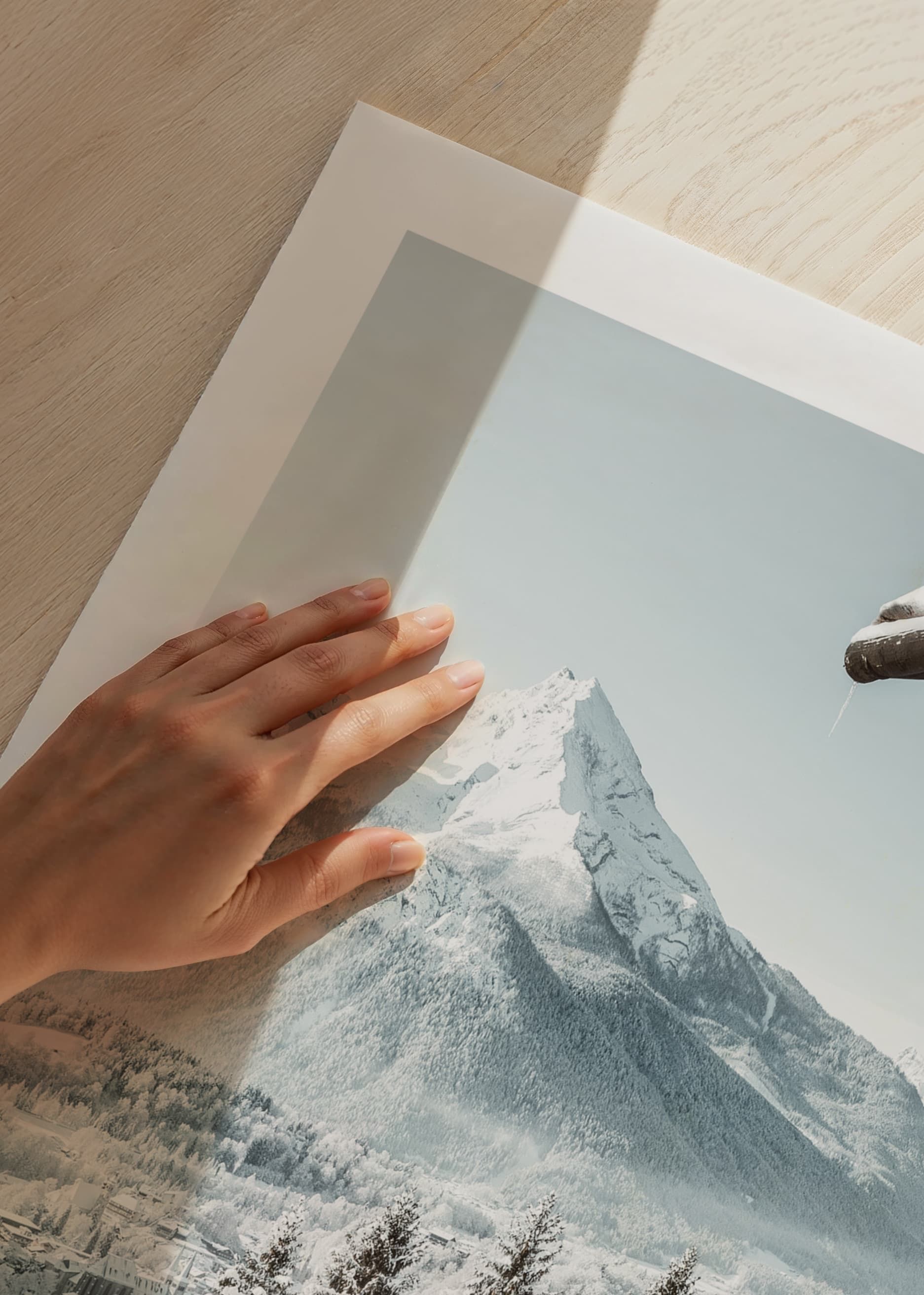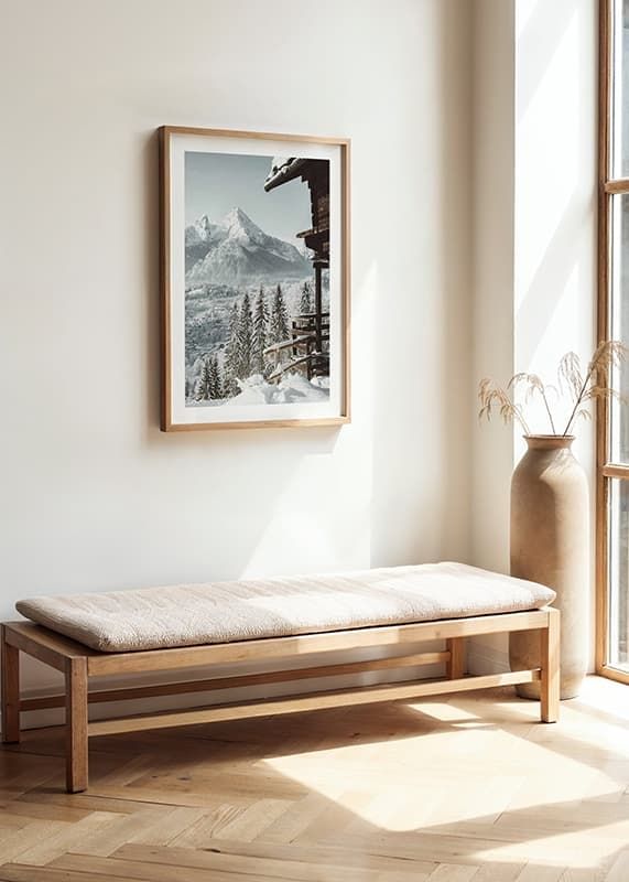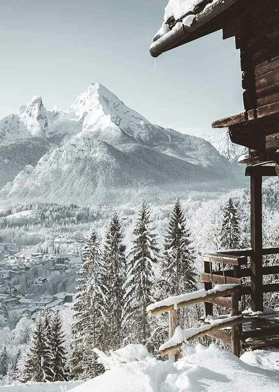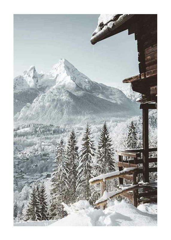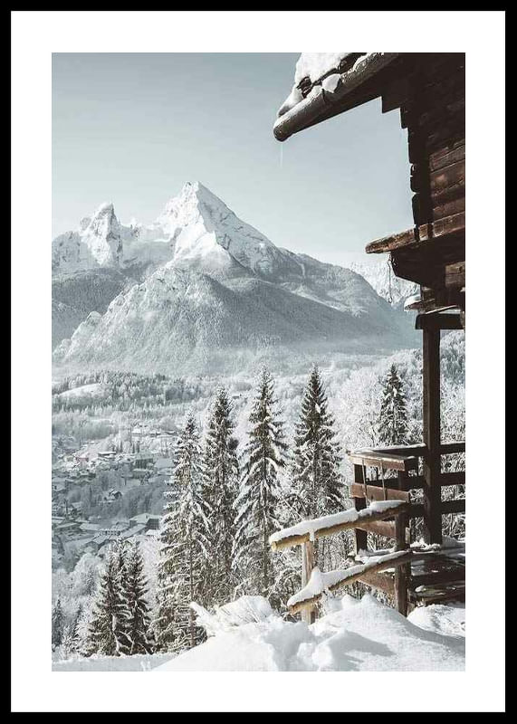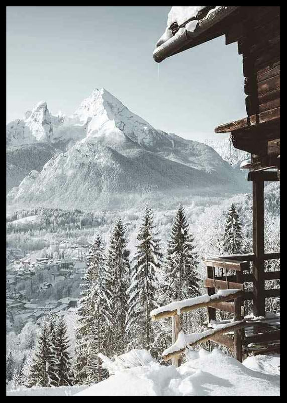 Snötäckta granar reser sig framför en stram trästuga som vilar vid kanten av sluttningen. Längre bort syns en liten alpin by och dramatiska bergstoppar, allt inbäddat i vintervitt ljus. Denna poster fångar kontrasterna mellan träets mörka toner och landskapets ljusa nyanser och ger ett svalt tillskott till vardagsrum eller hall.