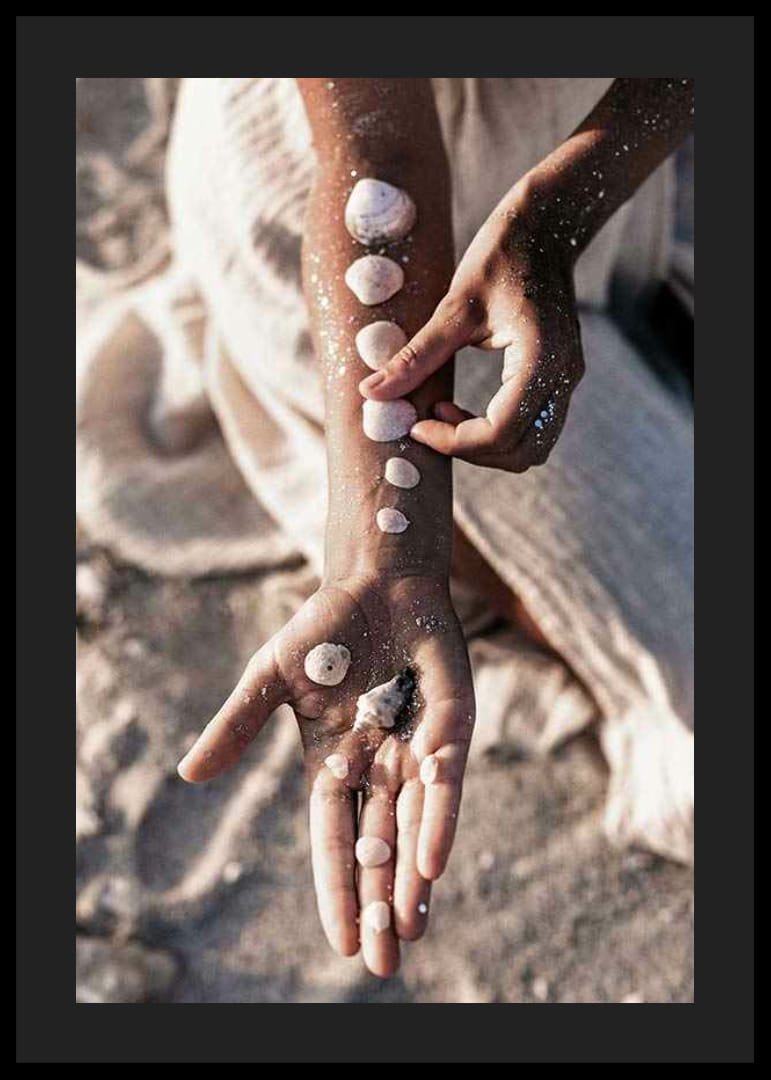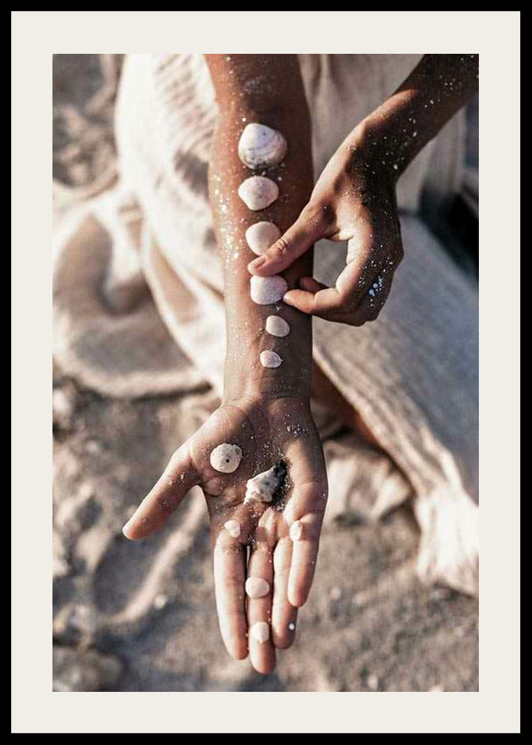 Närbild av en arm vilande mot sanden, med små vita snäckor placerade i rad längs huden och några i den öppna handflatan. Mjukt solljus och sandprickar på handen förstärker den somriga känslan. Denna poster ger en naturnära och avslappnad atmosfär som passar utmärkt i vardagsrum eller sovrum.