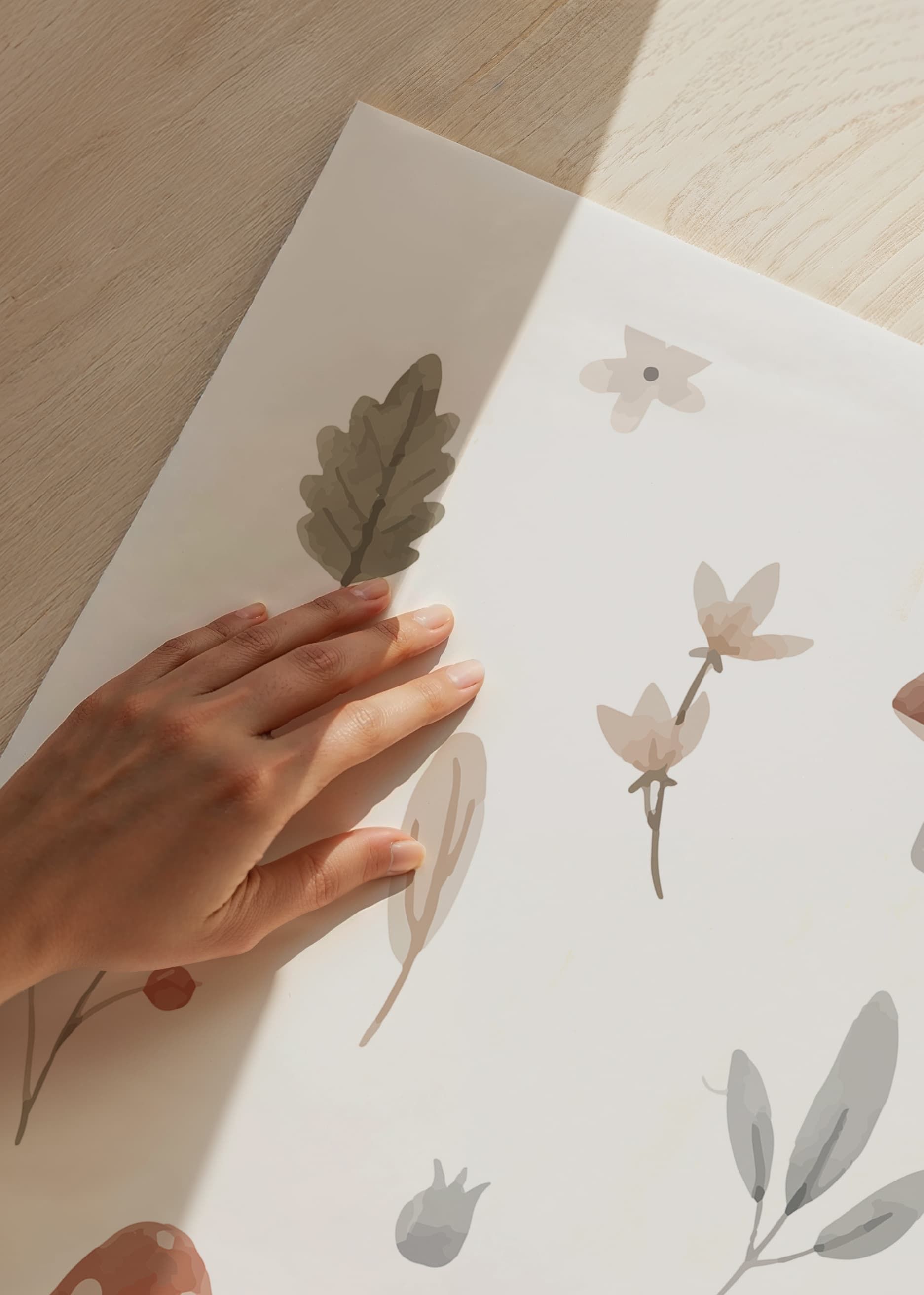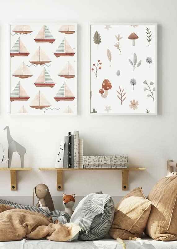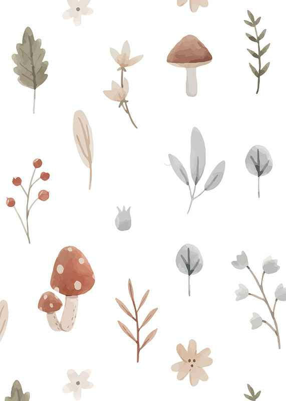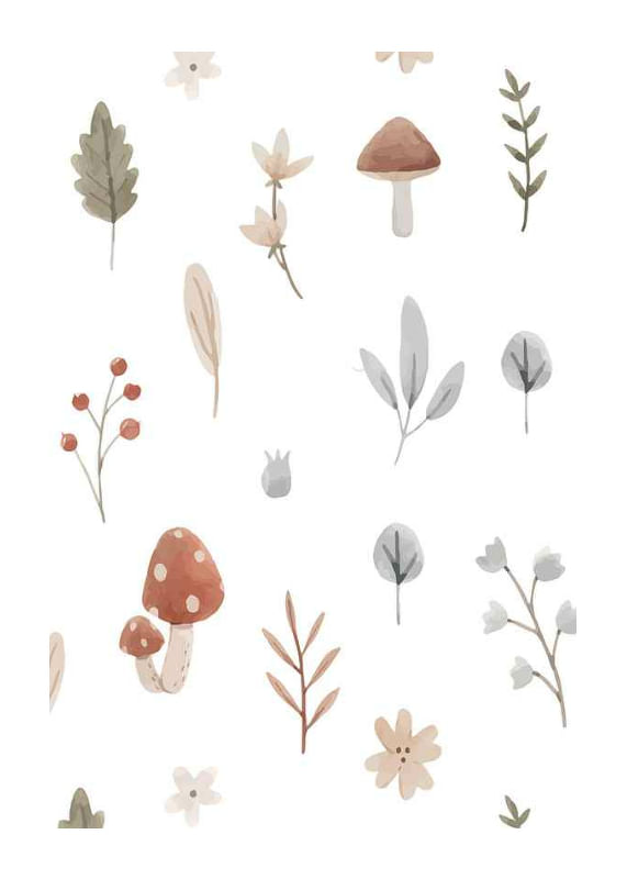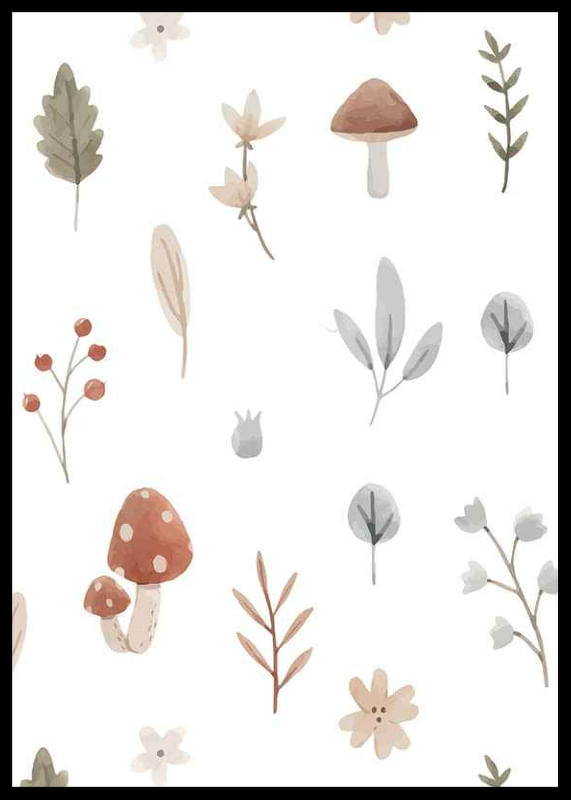 Motivet samlar små akvarellmålade svampar, blad, bär och blommor i milda naturtoner mot vit bakgrund. Enkelt arrangerade detaljer ger ett lekfullt och lugnt intryck. Denna poster passar i barnrum eller lekrum där ett naturnära uttryck uppskattas och kan kombineras med andra motiv från samma kategori.