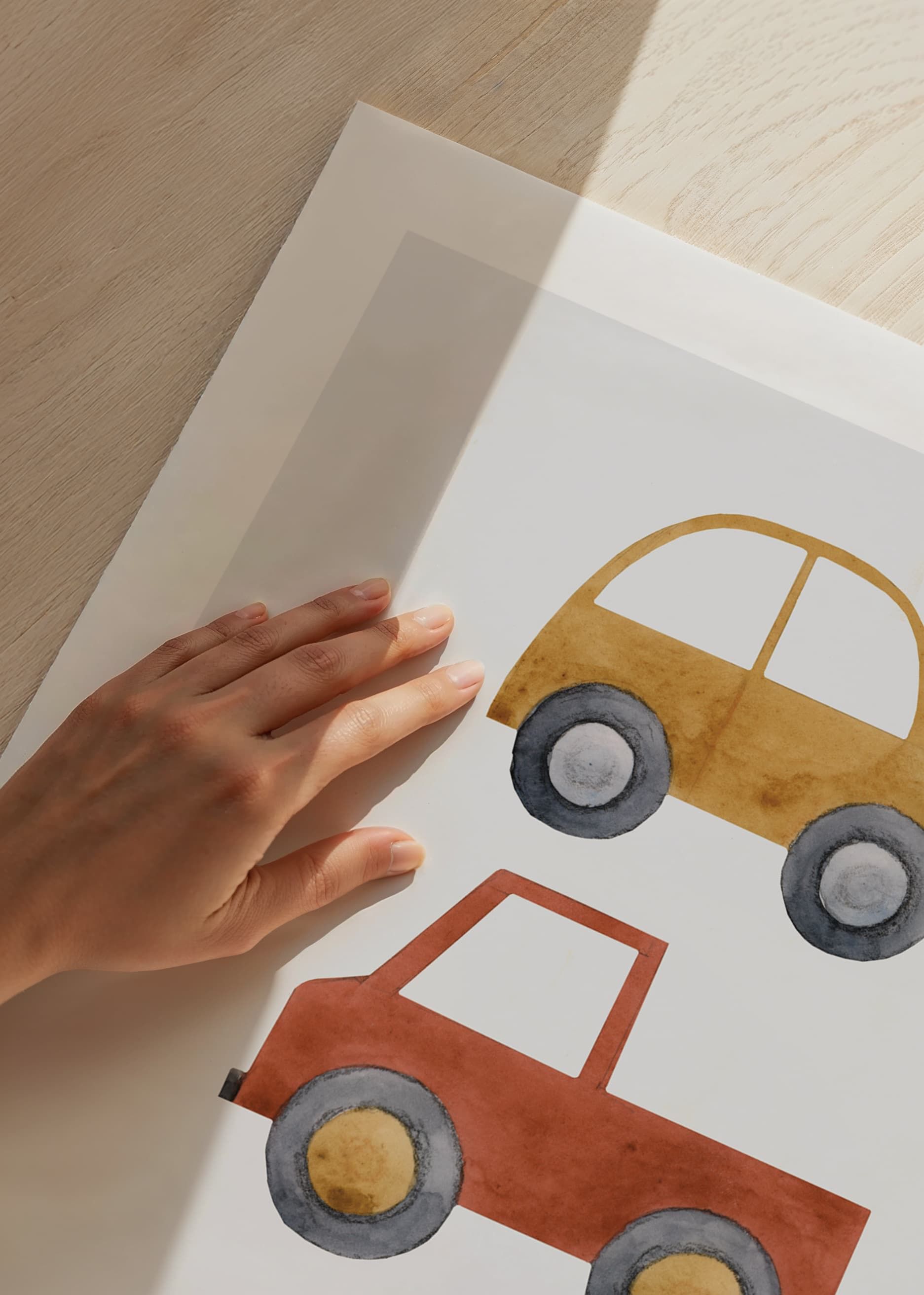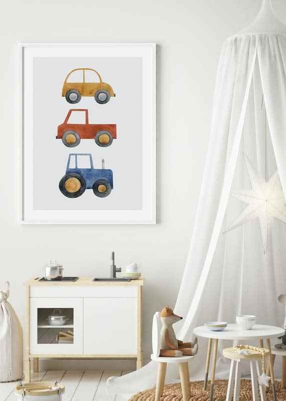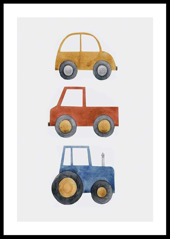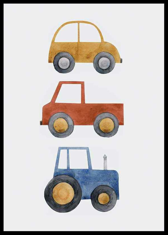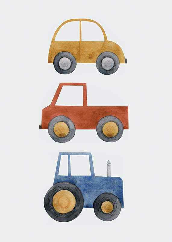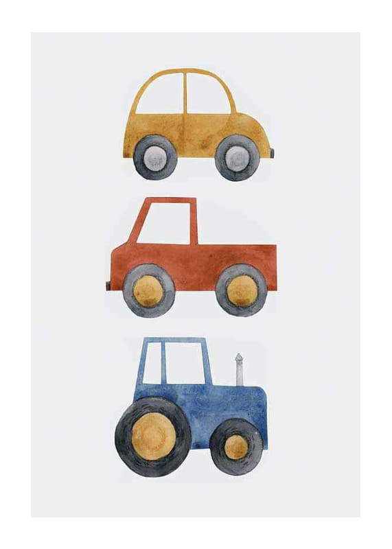 Motivet består av tre fordon målade i akvarellstil: en gul bil överst, en röd bil i mitten och en blå traktor längst ner. Alla figurer har tydliga svarta hjul och enkla former mot en ljusgrå bakgrund. Denna poster passar bra i barnrum och bidrar med lekfulla färger och tydliga motiv som inspirerar till fantasi.