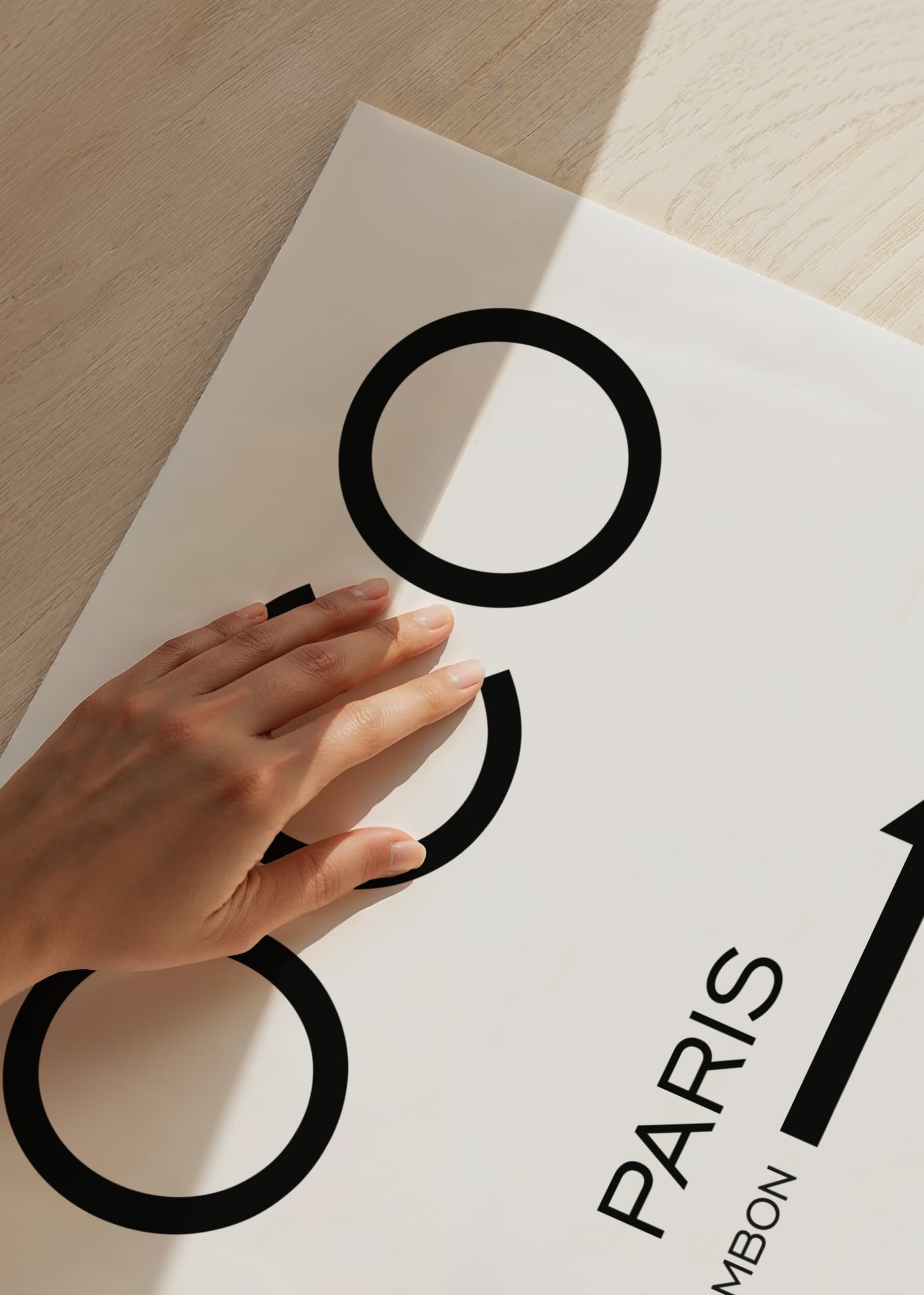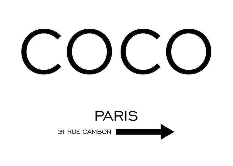 Stora svarta bokstäver formar ordet COCO centrerat på vit bakgrund. Under syns texten PARIS följt av adressen 31 Rue Cambon och en svart pil åt höger. Den stilrena och avskalade designen ger postern ett modernt uttryck som fungerar i exempelvis hall, sovrum eller på en vägg i din walk-in-closet.