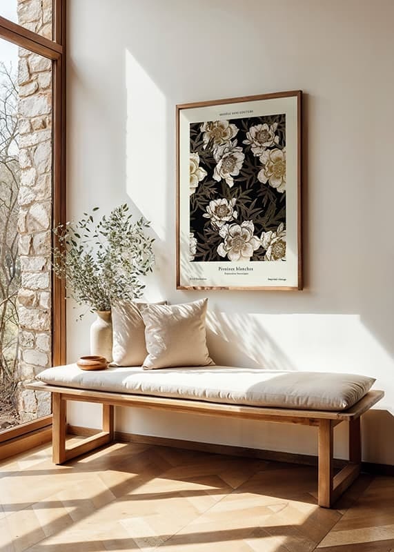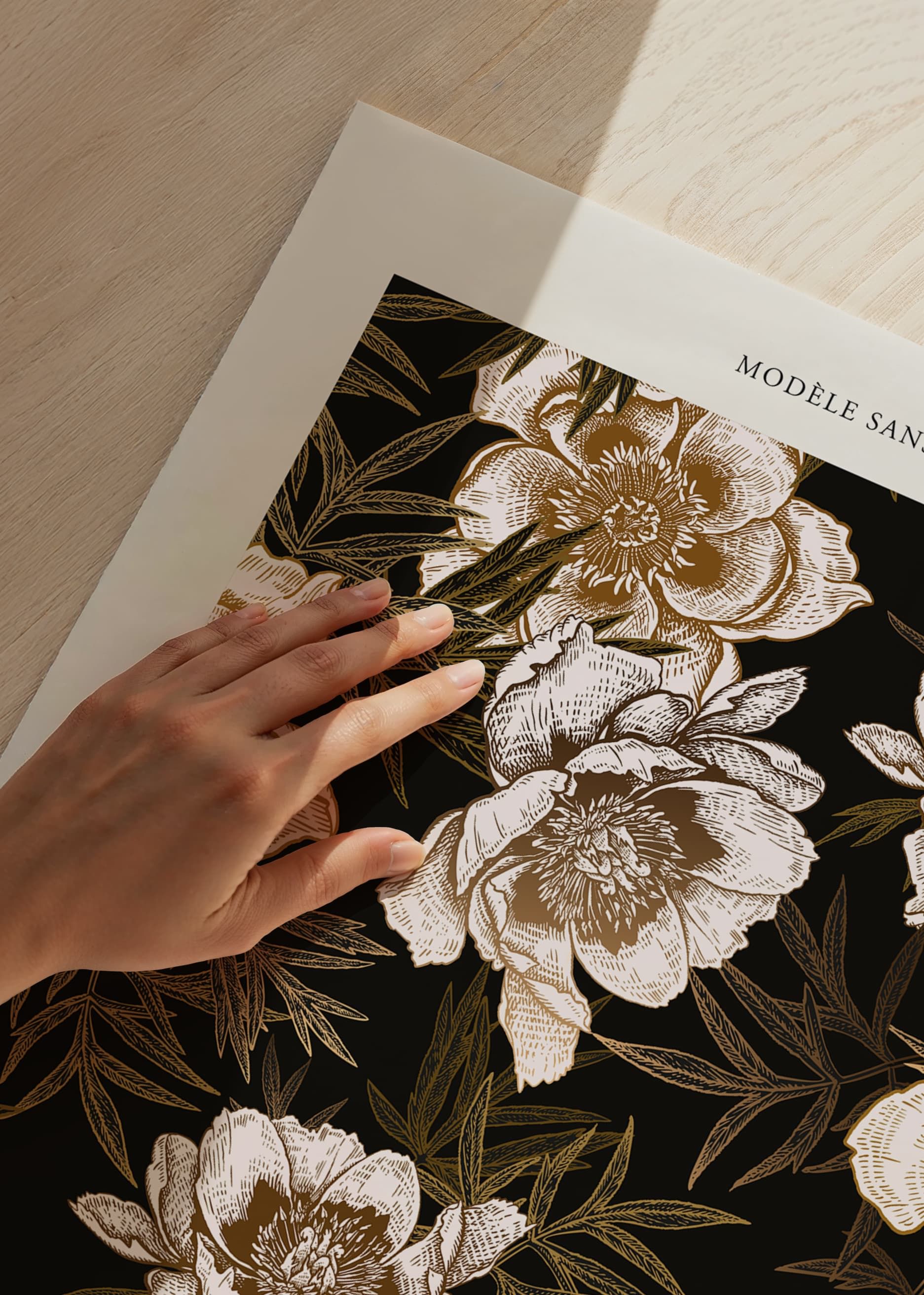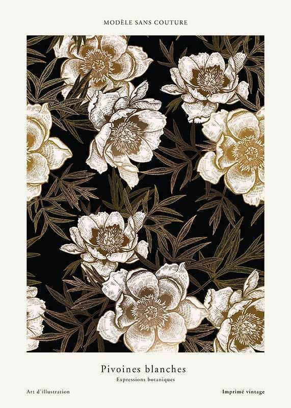 Detaljrik illustration av vita pioner med inslag av beige och bruna toner, omgivna av tunna bladverk på djup svart bakgrund. Motivets täta mönster skapar ett klassiskt, botaniskt uttryck. Denna poster adderar en tidlös känsla och passar utmärkt i vardagsrum eller sovrum med naturtema.