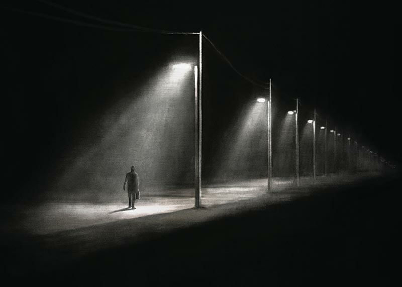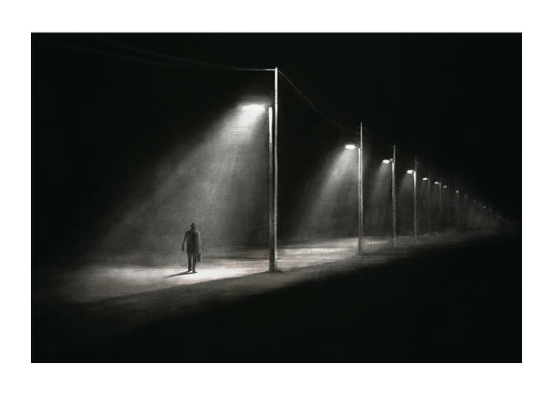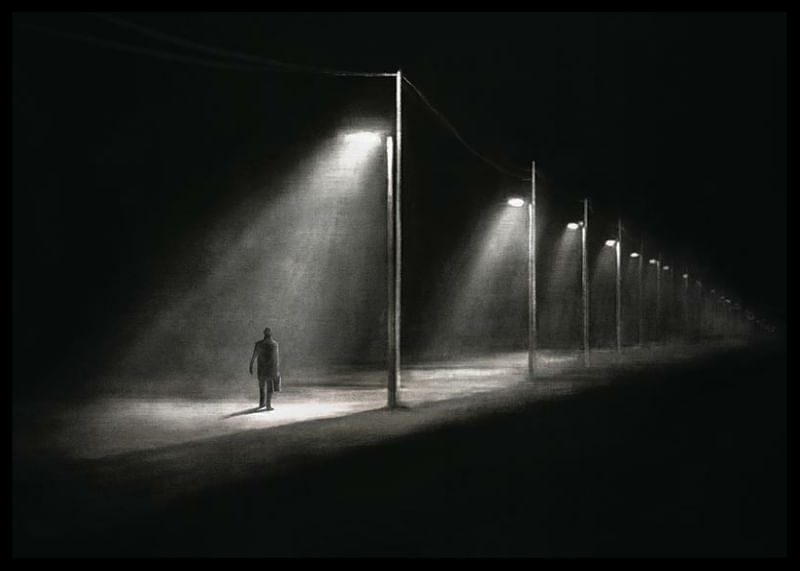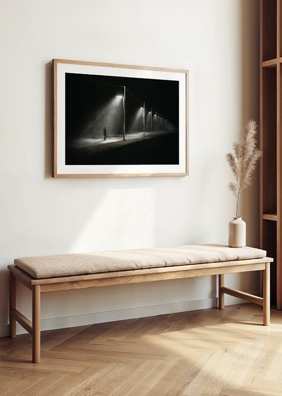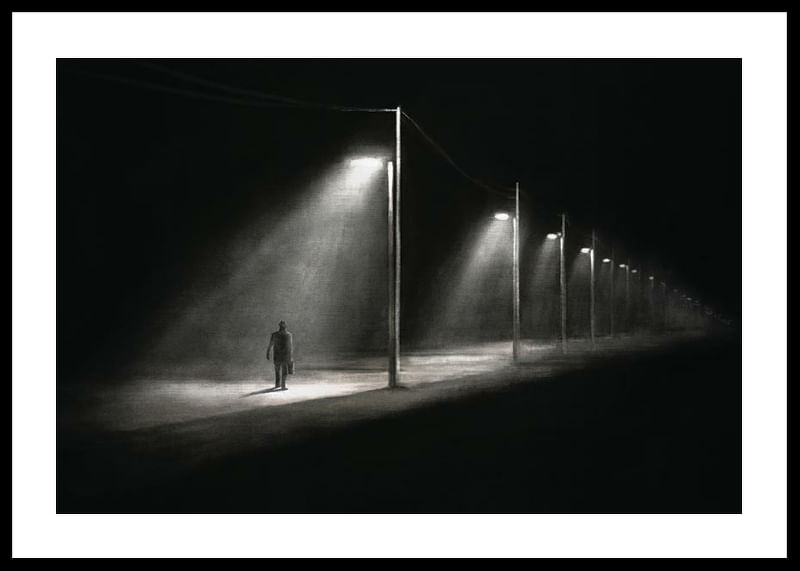 En silhuett av en ensam man som promenerar under en rad tända gatlyktor längs en övergiven väg i natten. Skarpa kontraster mellan ljus och mörker skapar en grafisk effekt som förstärker känslan av avskildhet. Denna poster ger ett påtagligt och stämningsfullt uttryck till exempelvis hall eller vardagsrum.