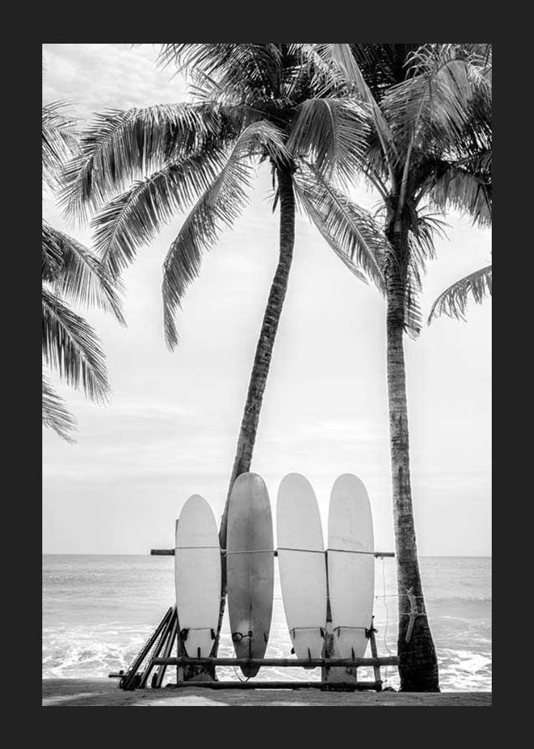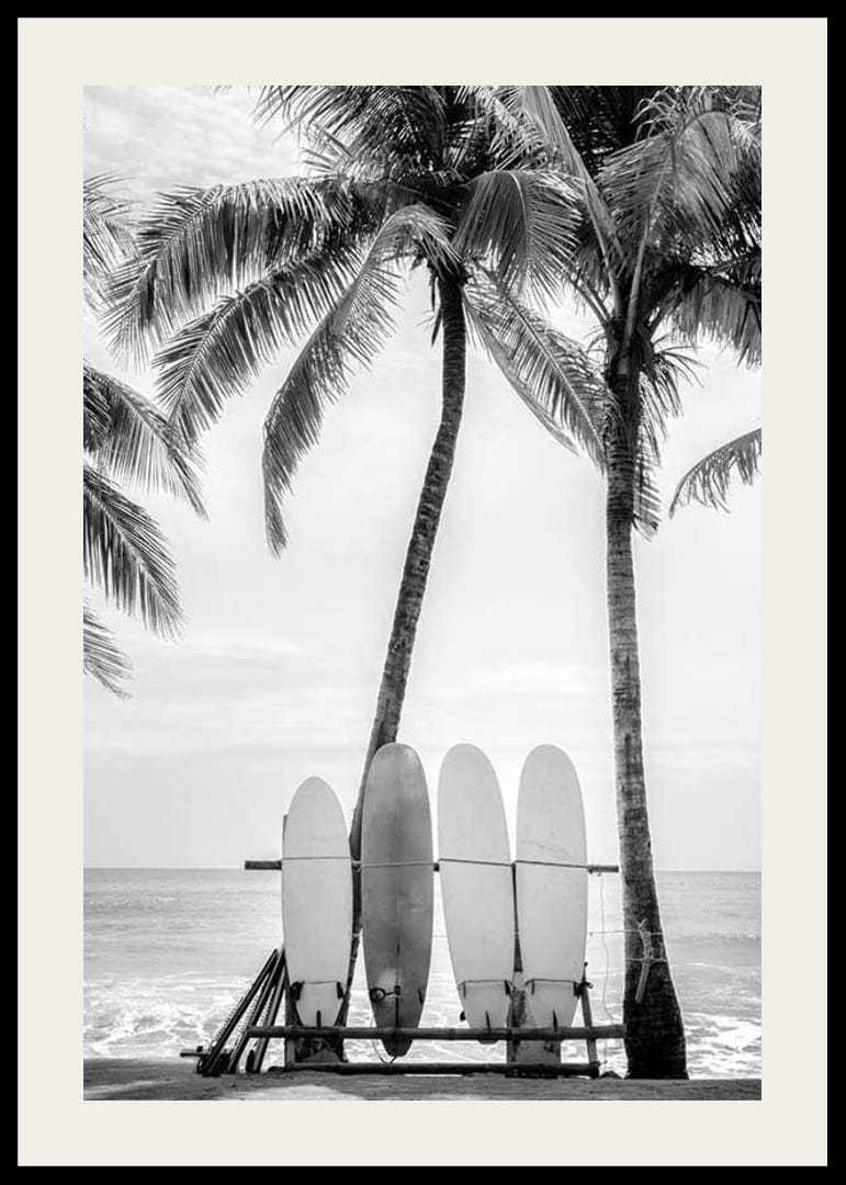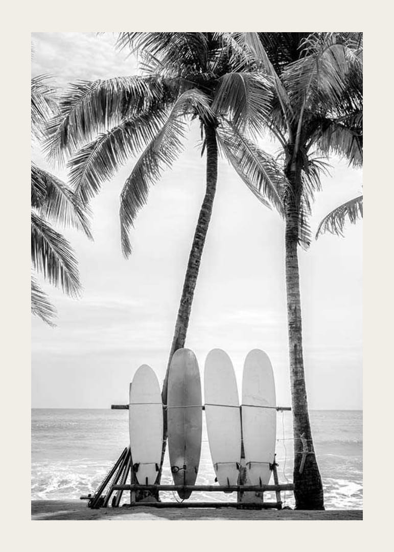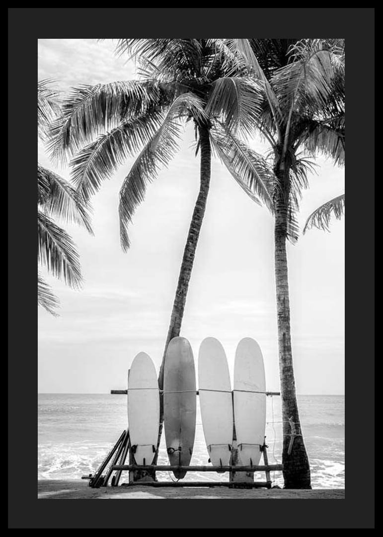 Fyra surfbrädor står uppradade på en strand med stora palmträd och horisonten synlig i bakgrunden. Det svartvita fotografiet fångar strandens avslappnade atmosfär med tydliga kontraster mellan brädorna, träden och himlen. Motivet gör denna poster till ett stilrent inslag i vardagsrum eller hall.