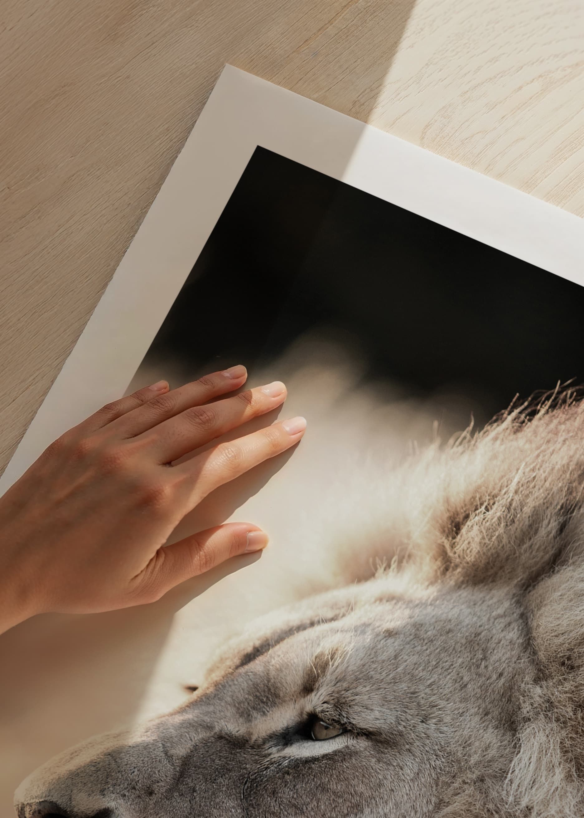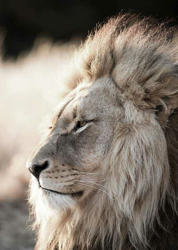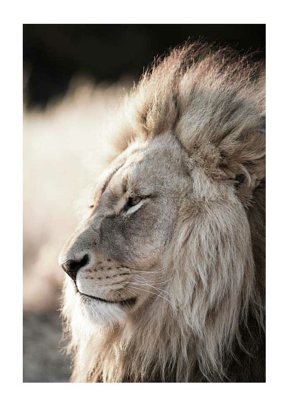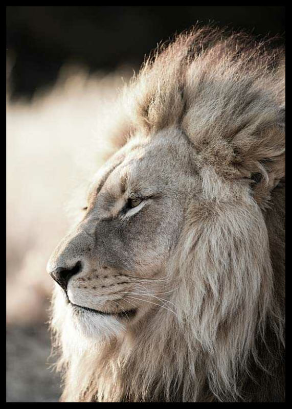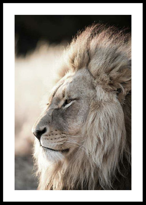 Närbild på en afrikansk lejonhane med imponerande man, fångad i sidoprofil mot ljus och diffus bakgrund. Tonerna går i beige och brunt vilket bidrar till ett naturligt och stillsamt uttryck. Den här postern ger ett djurmotiv med tydliga detaljer och fungerar fint i både vardagsrum och arbetsrum.
