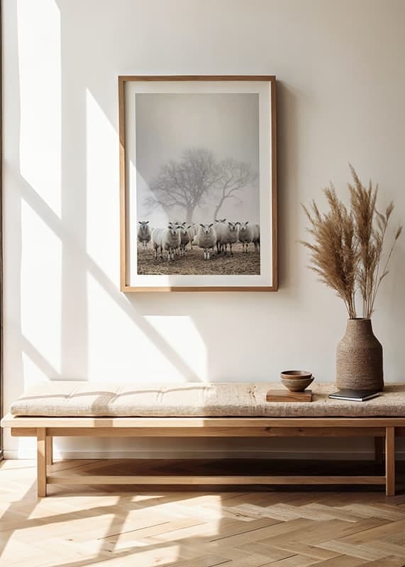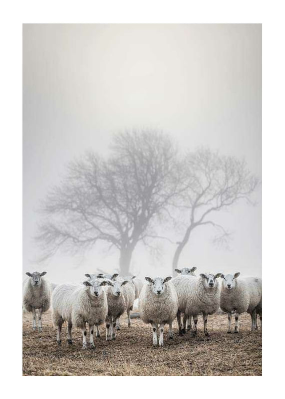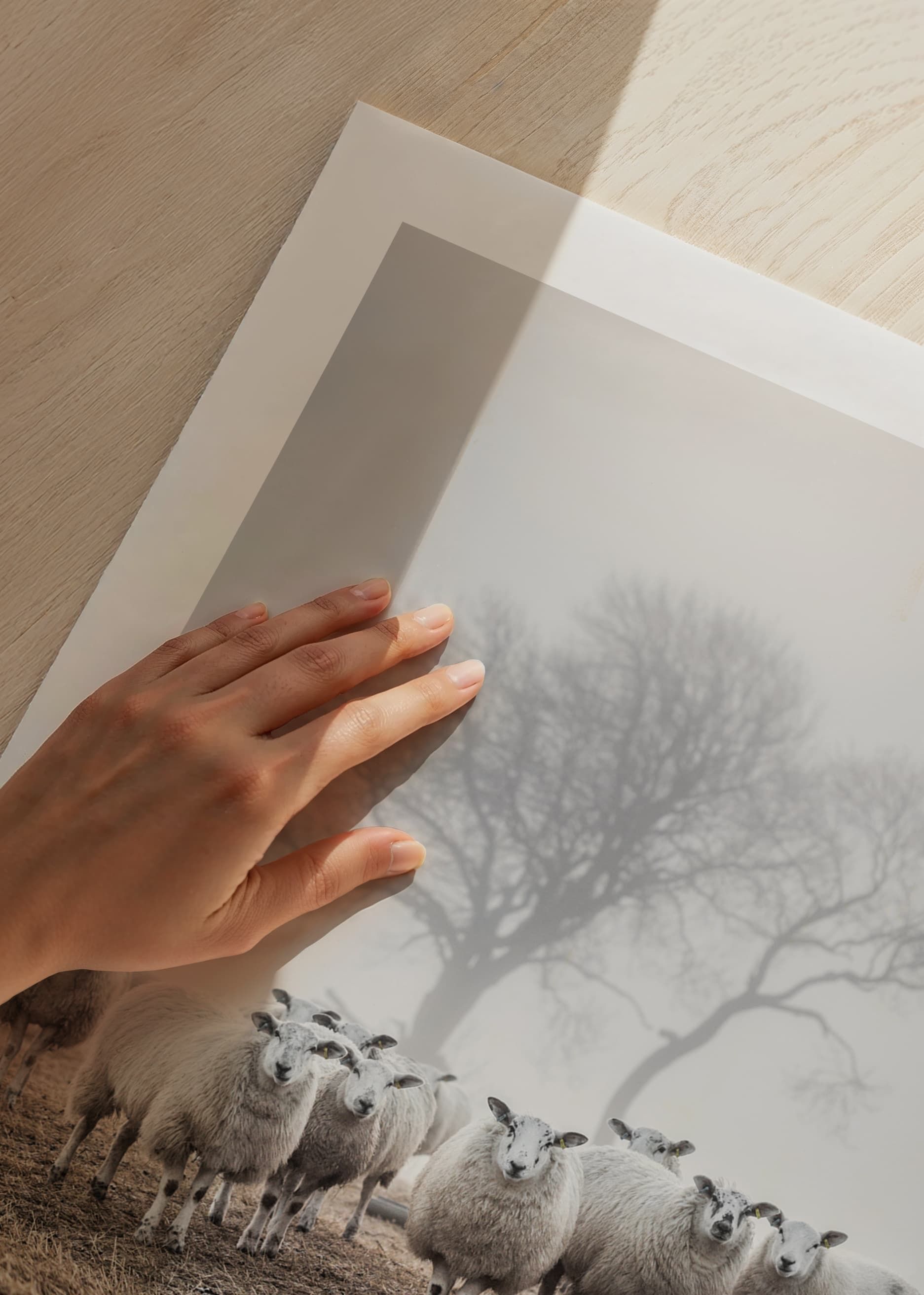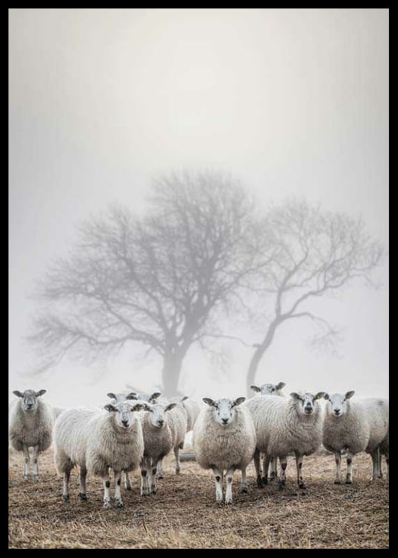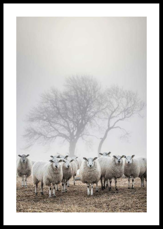 En grupp vita får står samlade på en brun åker medan tät dimma ligger över landskapet. Bakom djuren syns silhuetten av nakna träd som tonar bort i det mjuka ljuset. Naturmotivets jordnära färgskala och lugna komposition gör postern till ett stilrent och stillsamt tillskott i vardagsrum, hall eller sovrum.