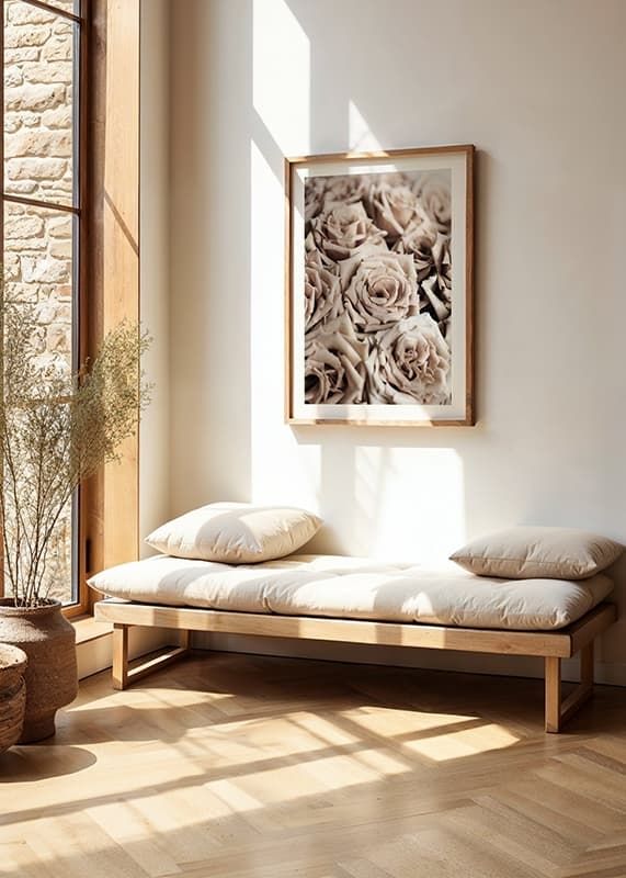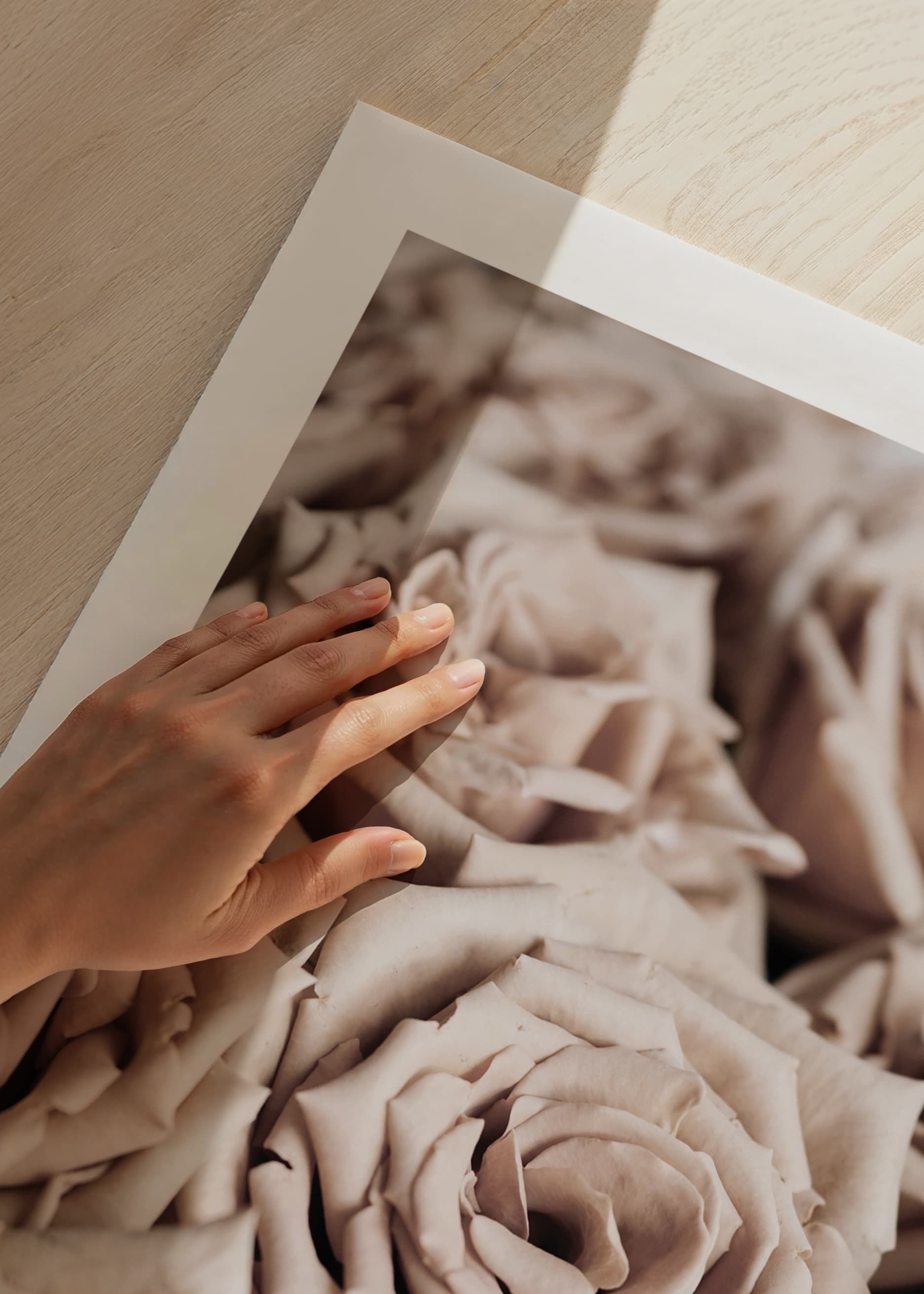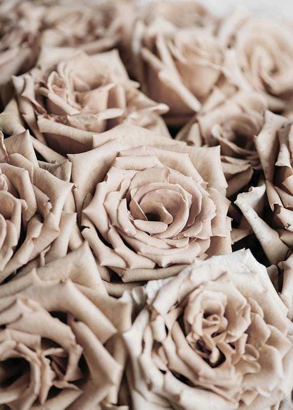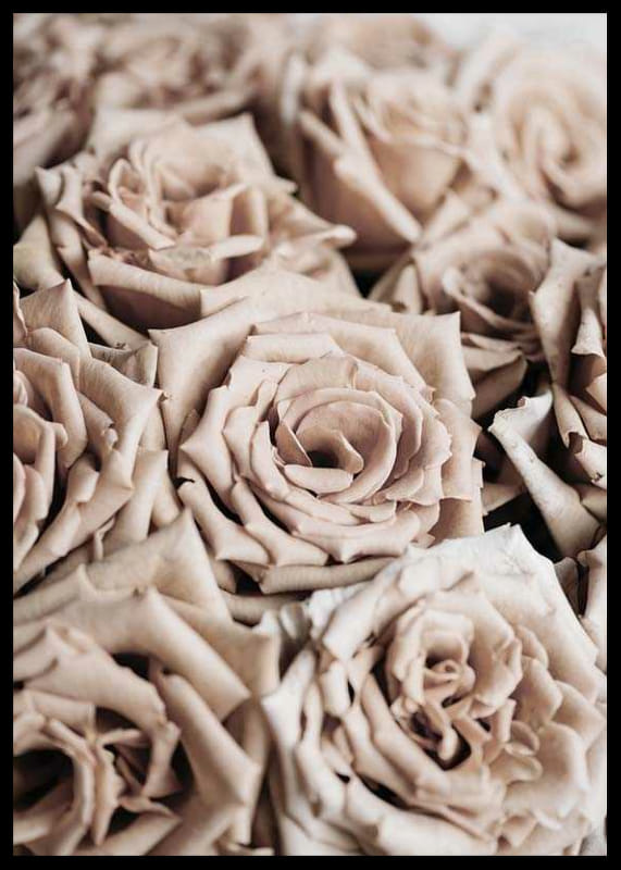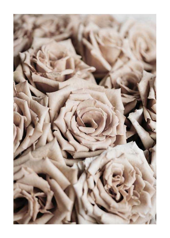 Närbild av täta rosor i dämpade beige och pudriga nyanser. Kronbladen har mjuk textur och detaljerna framträder tydligt i motivet, vilket ger en lugn och naturlig känsla. En botanisk poster som kompletterar höstens varma färger och passar lika bra i vardagsrum som i hall eller sovrum.