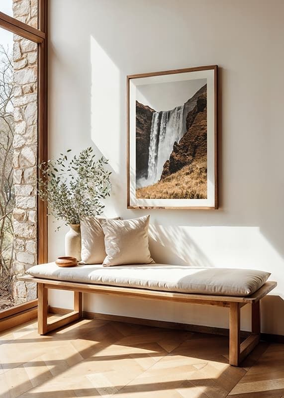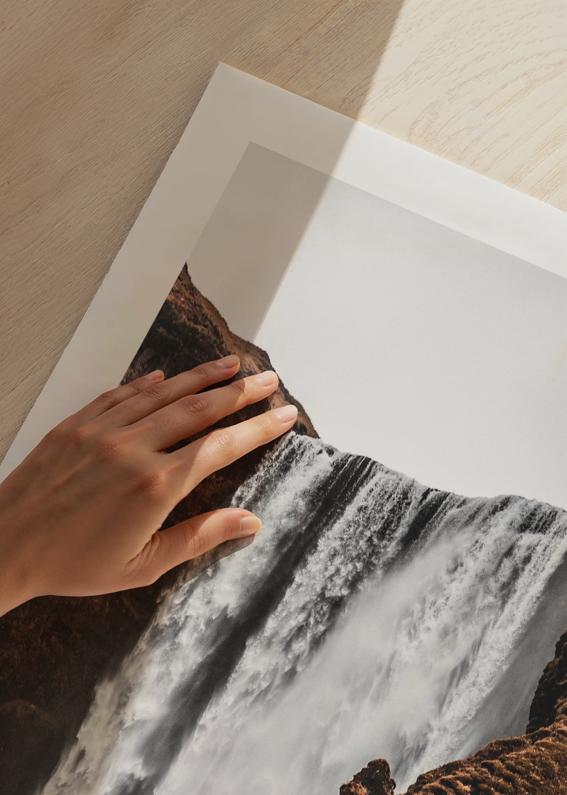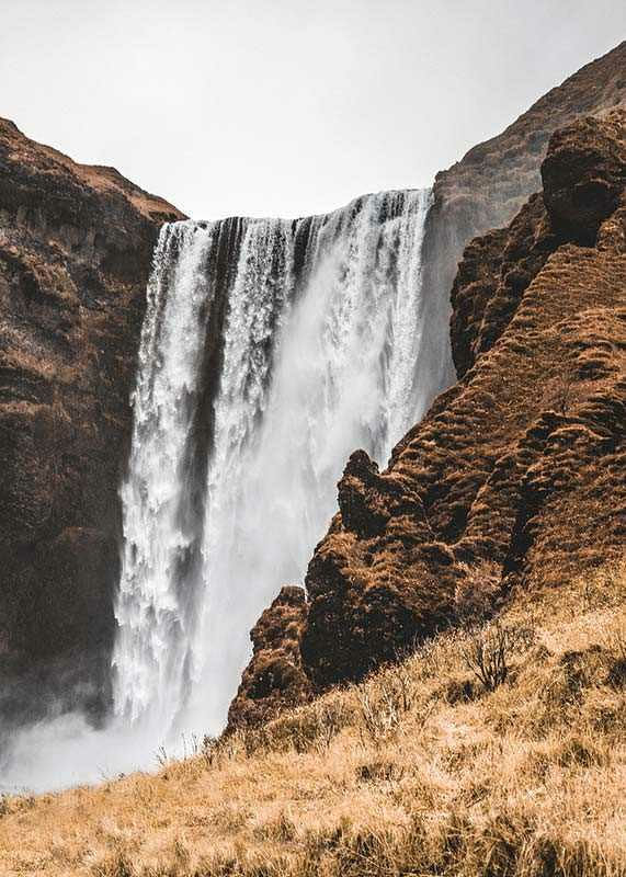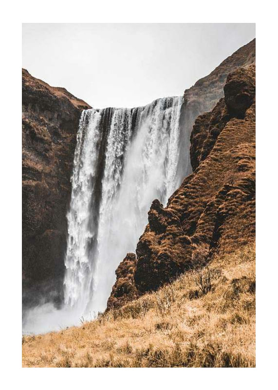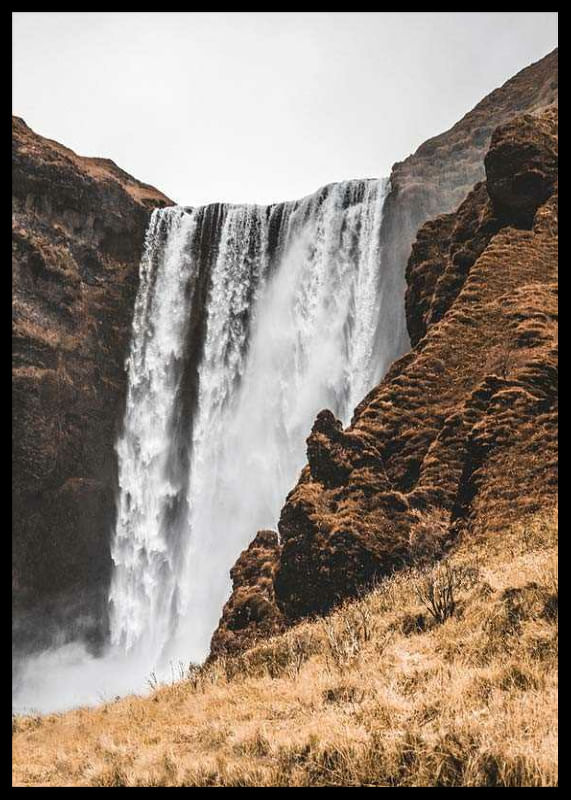 Kraftfulla vattenmassor störtar nerför Skogafoss, omgivna av bruna och guldfärgade klippor i hösttoner. Motivet fångar det ikoniska isländska landskapets råa skönhet. Med sin neutrala färgskala ger denna poster en naturlig och modern känsla till vardagsrum eller hall.
