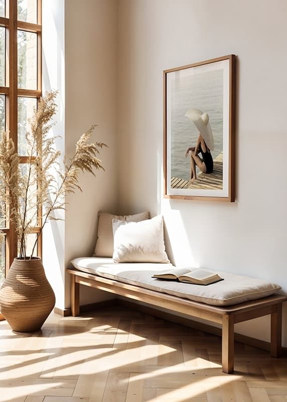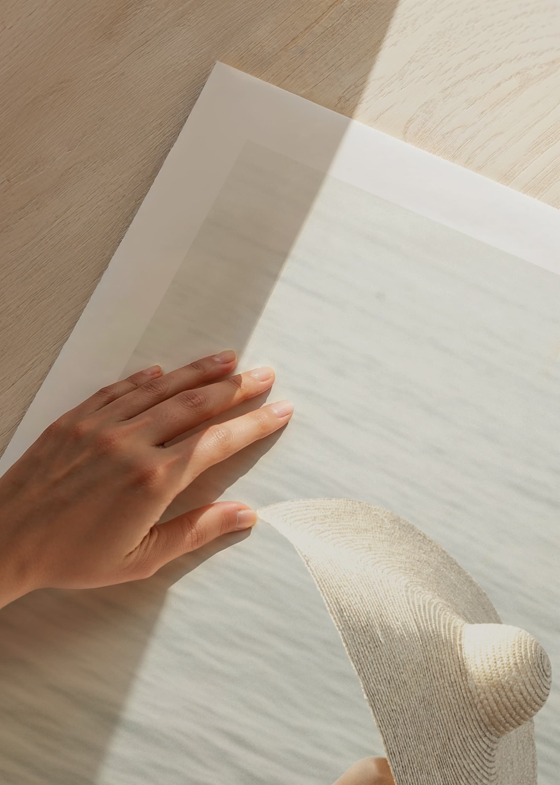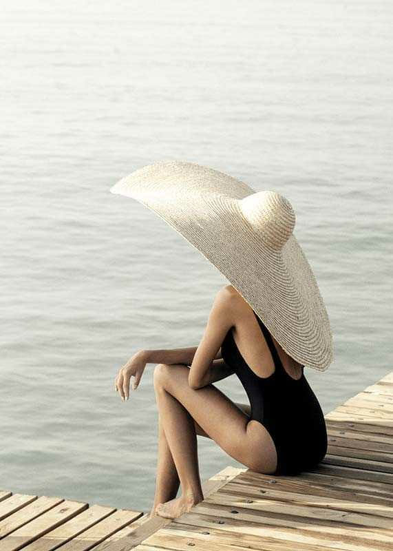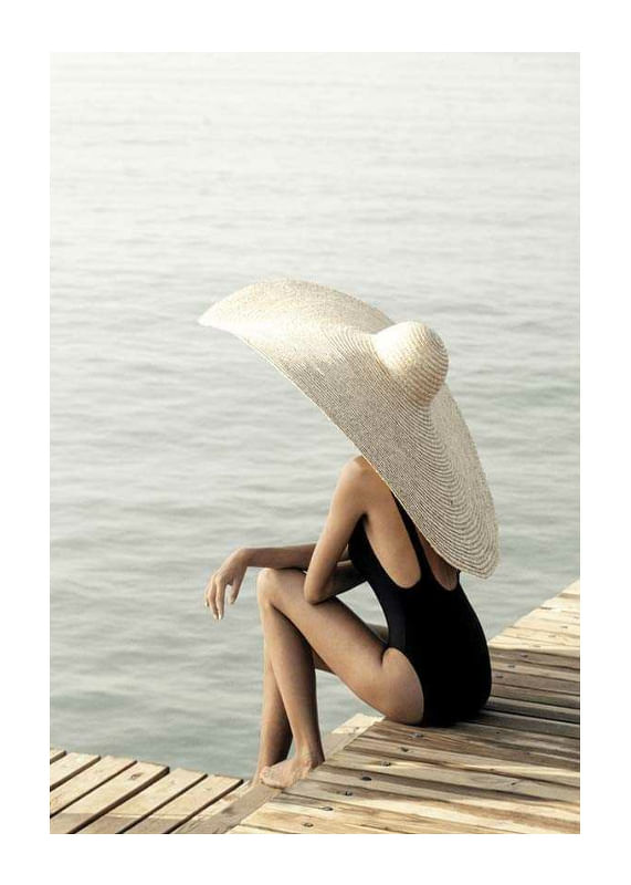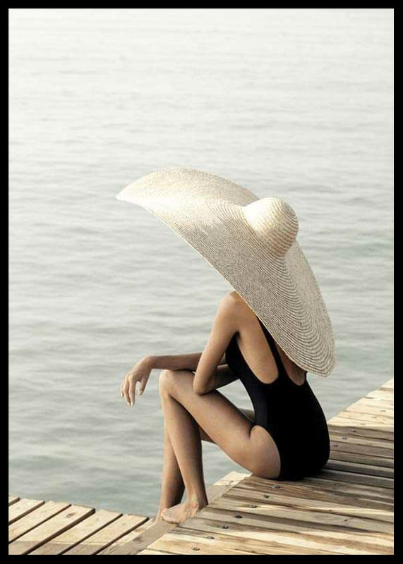 En kvinna sitter avslappnat på en brygga klädd i svart baddräkt och bär en stor solhatt i ljus halm. Det lugna vattnet breder ut sig i bakgrunden och skapar en somrig, minimalistisk känsla. Denna poster ger en modern och stilren atmosfär och passar bra i allt från vardagsrum till sommarhus.