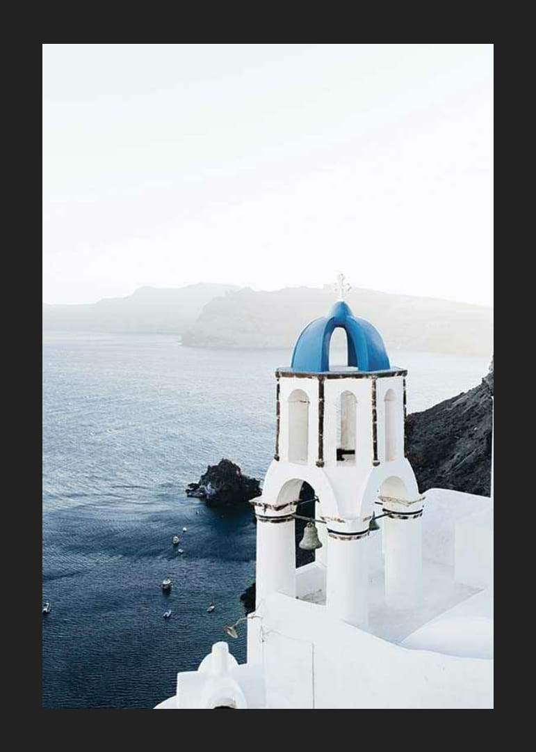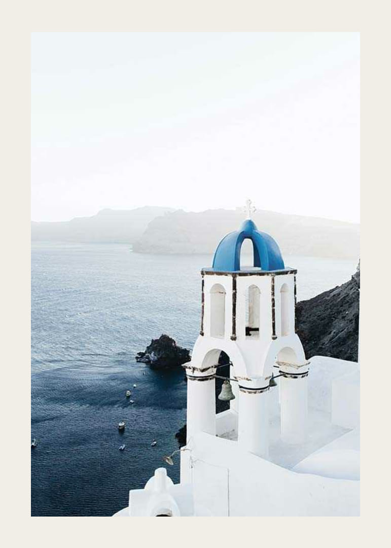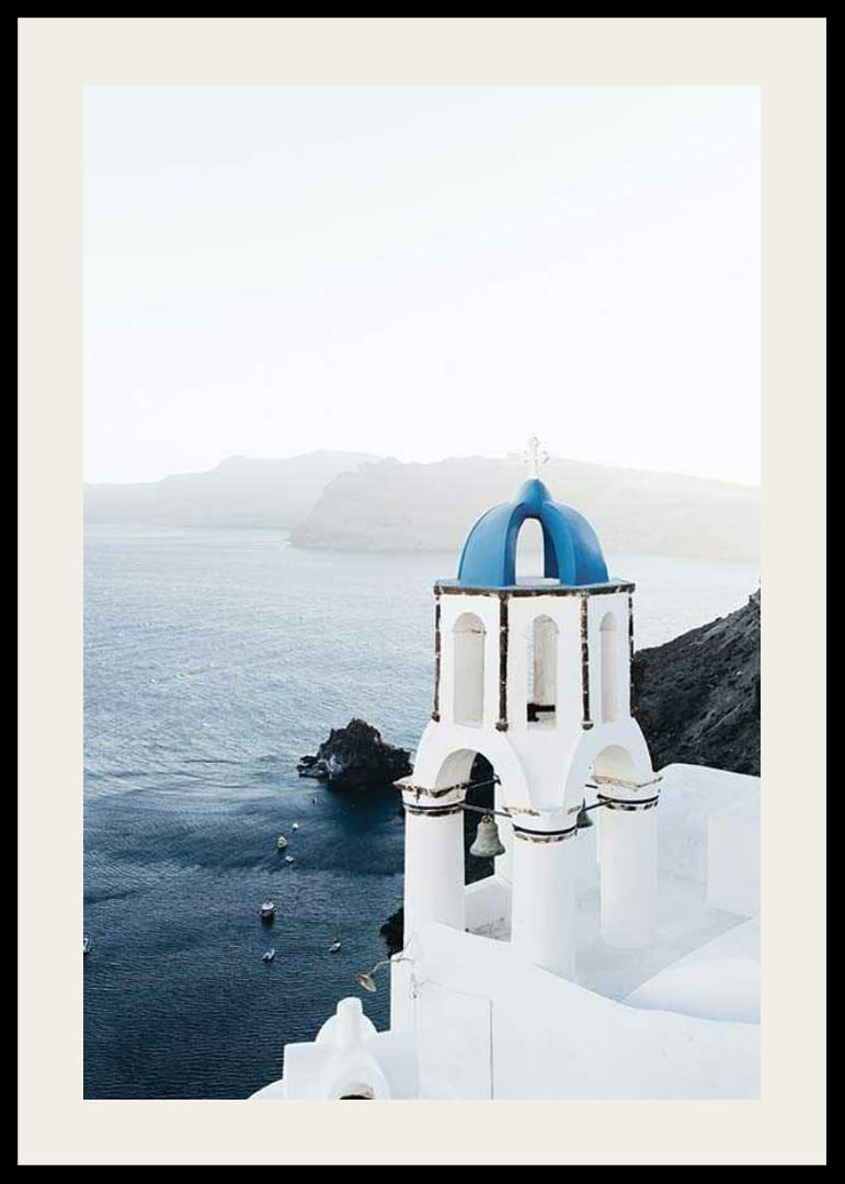 Poster med motiv från Santorini, den grekiska ön känd för sina vita byggnader och blå tak. Ett vitkalkat klocktorn med karakteristisk blå kupol reser sig mot Egeiska havet och berg. Passar i rum inspirerade av resor eller för att skapa en ljus och luftig känsla.