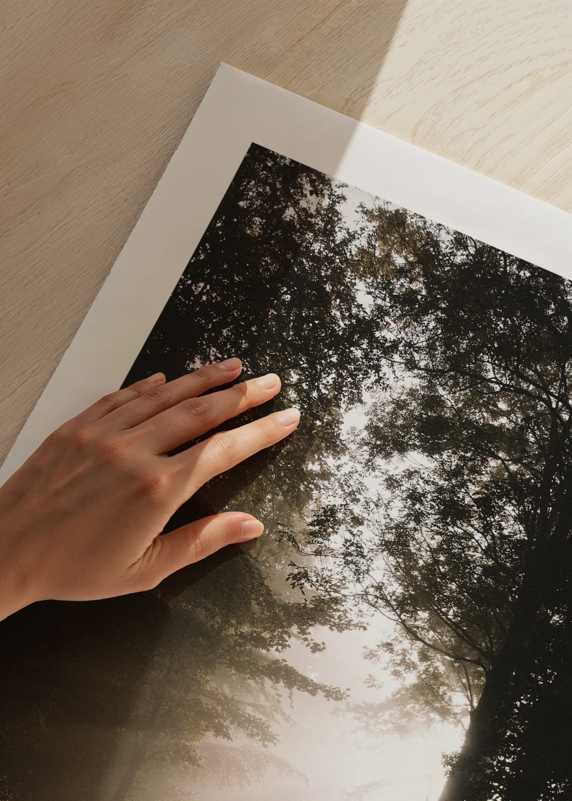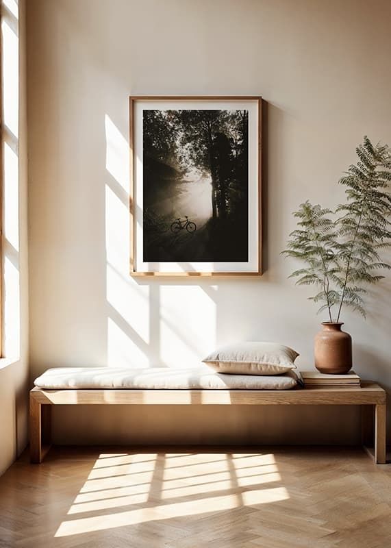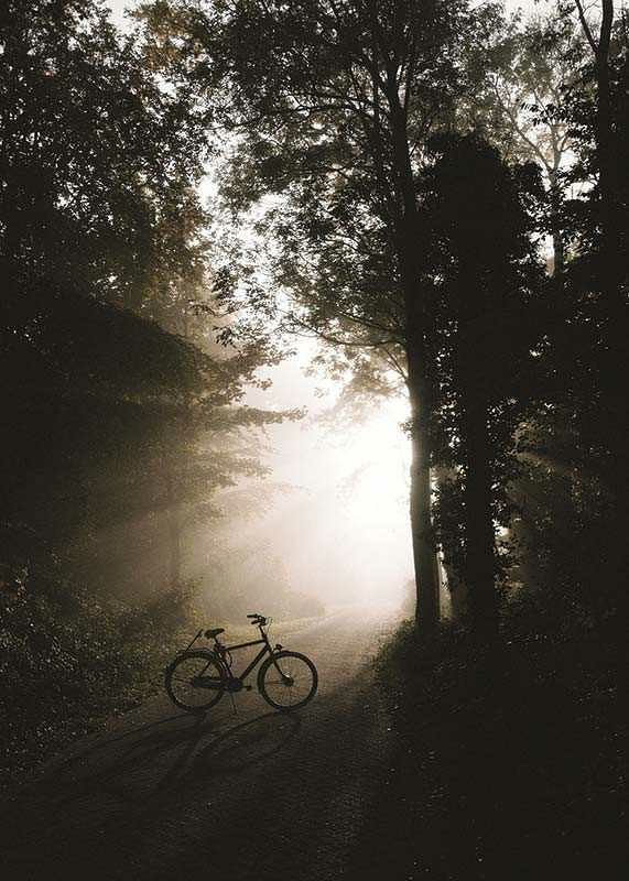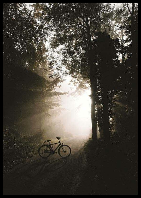 En ensam cykel står på en smal grusväg omgiven av tät skog, där morgondimma och låga solstrålar skapar mjuka kontraster mellan ljus och skugga. Trädens silhuetter ramas in av det vita, diffusa ljuset i bakgrunden. Denna poster ger rummet en känsla av stillhet och närhet till naturen.