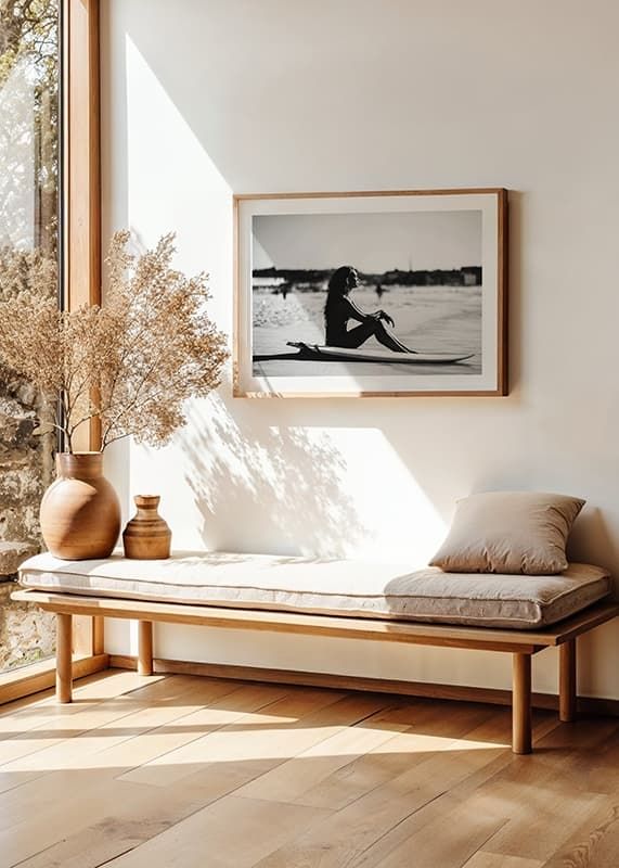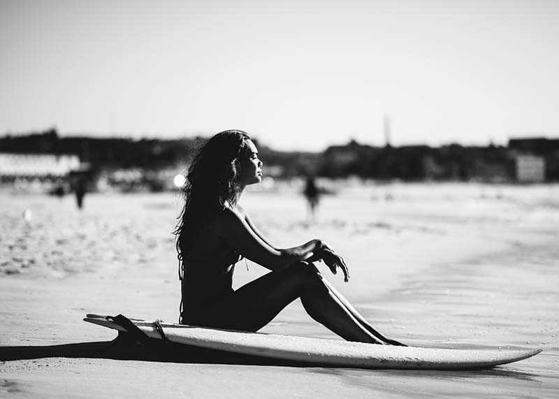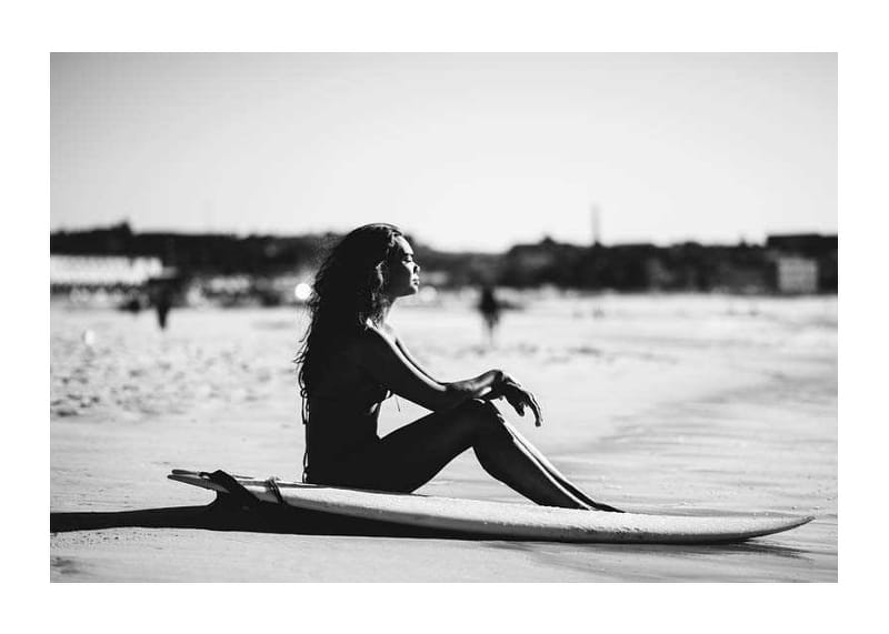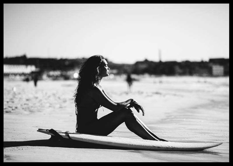 En kvinna sitter avslappnat på sin surfbräda vid vattenbrynet på en solig sandstrand. Det svartvita fotografiet har starka kontraster mellan ljus och skugga med suddig bakgrund som antyder människor och stadssilhuett. Den tidlösa känslan i motivet gör postern passande för moderna vardagsrum eller arbetsrum.