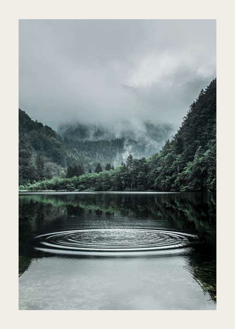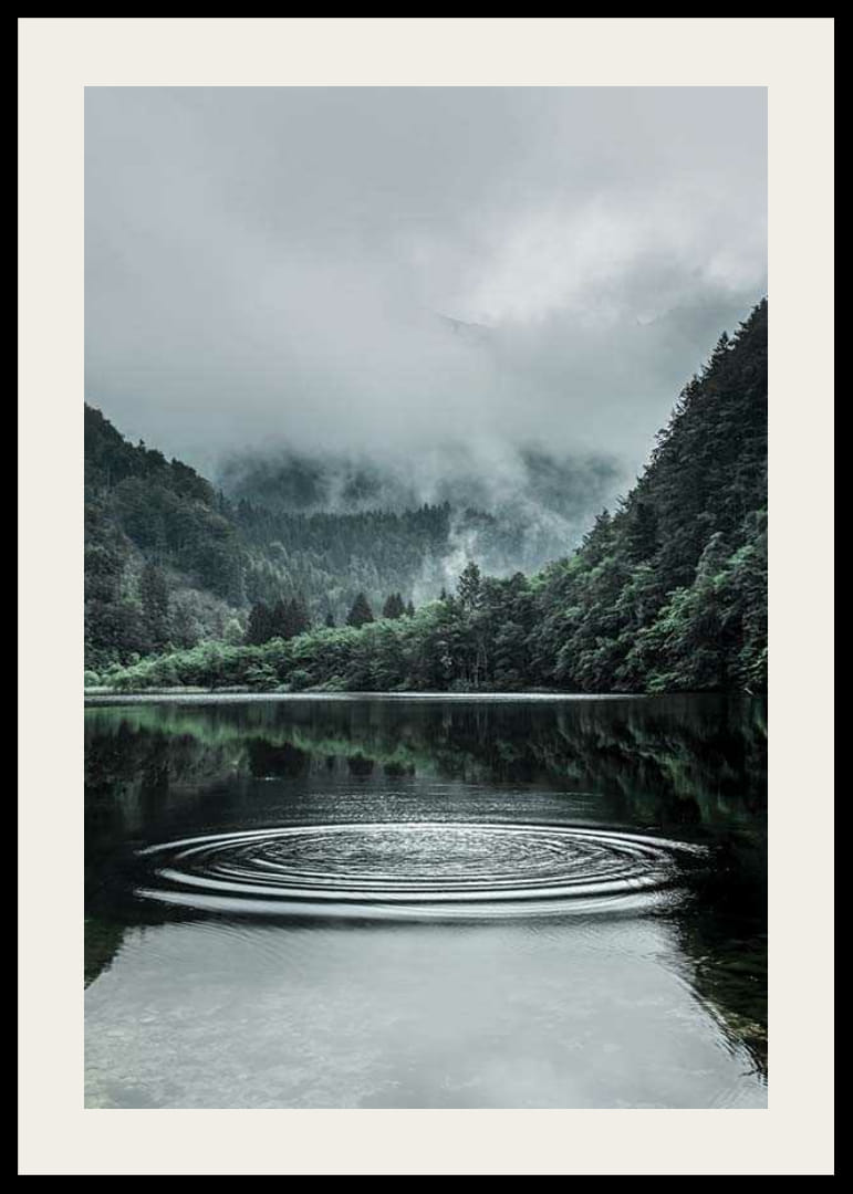 Dimhöljda berg reser sig bakom en stilla sjö där koncentriska ringar sprider sig över vattenytan. Gröna träd omger vattnet och hela scenen reflekteras i sjöns glasiga yta. Naturliga blågröna och grå toner dominerar. Den här postern passar utmärkt för dig som vill skapa ett avskalat och naturnära uttryck i hemmet.