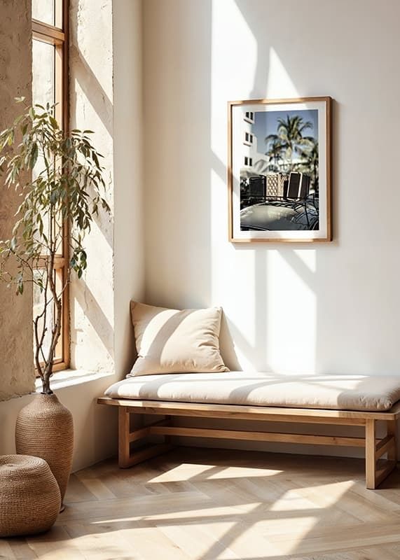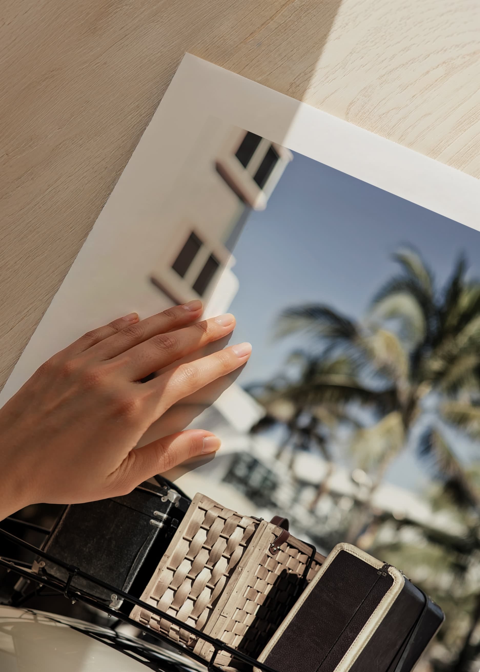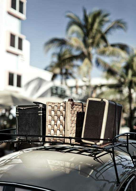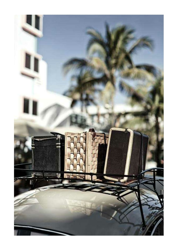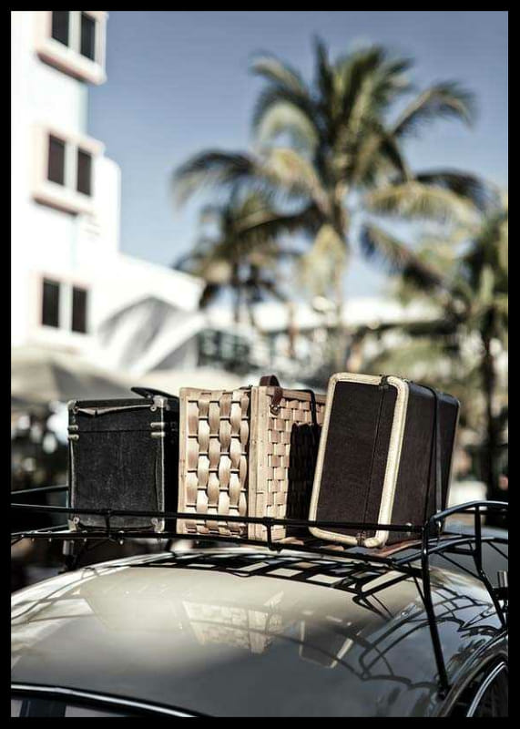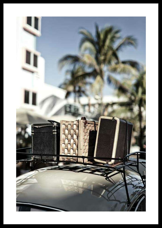 Gamla resväskor i olika material och färger ligger packade på ett bilräcke, med palmer och ett hotell liknande hus suddigt i bakgrunden. Solbelyst scen med retrostil som skapar en känsla av semester och nostalgi. Perfekt för att ge vardagsrum eller hall en avslappnad, somrig atmosfär med denna poster.