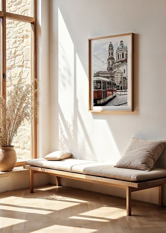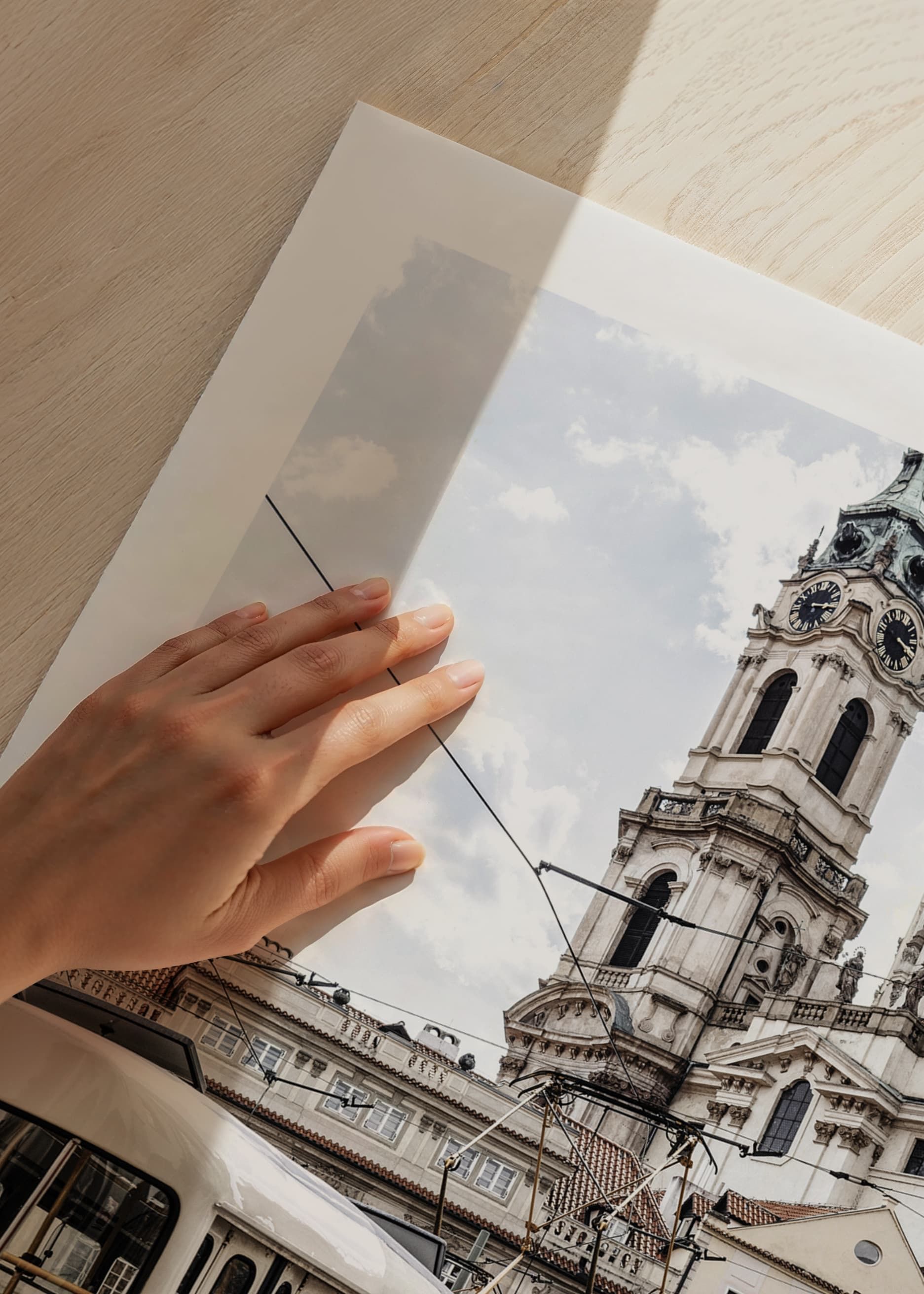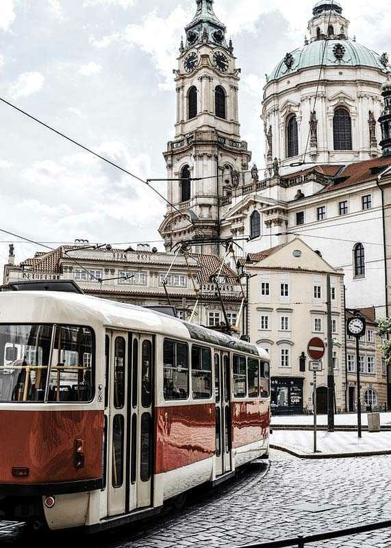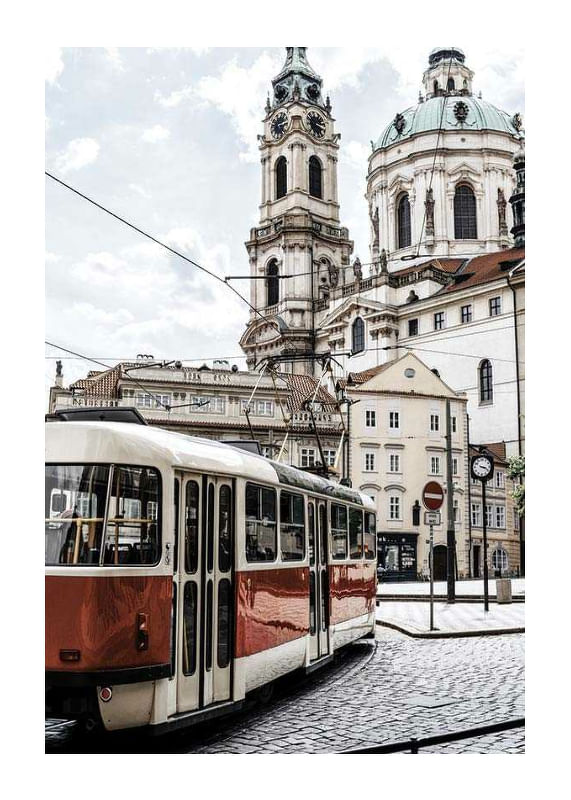 En äldre rödvit spårvagn syns på kullerstensgata framför historiska byggnader och kupolprydda kyrktorn i stadsdelen Malá Strana, Prag, Tjeckien. Ljusa toner och arkitektoniska detaljer ger denna poster en klassisk stadskänsla med en touch av europeisk historia.