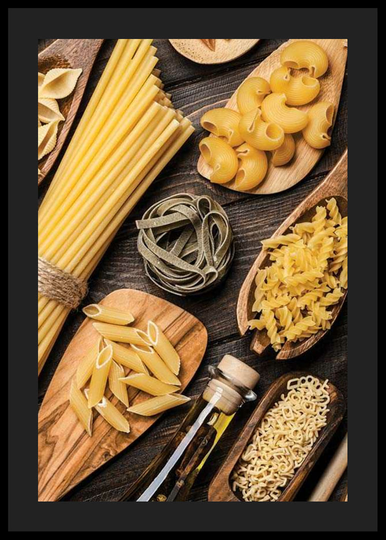 Flera olika pastasorter som spaghetti, penne och fusilli ligger utplacerade på träfat ovanpå ett mörkt träbord. Motivets varma toner och kontrasterande former skapar en stilren och matglad känsla. Den här postern lyfter kökets inredning och passar lika bra i matsalen med sin inspirerande kulinariska atmosfär.