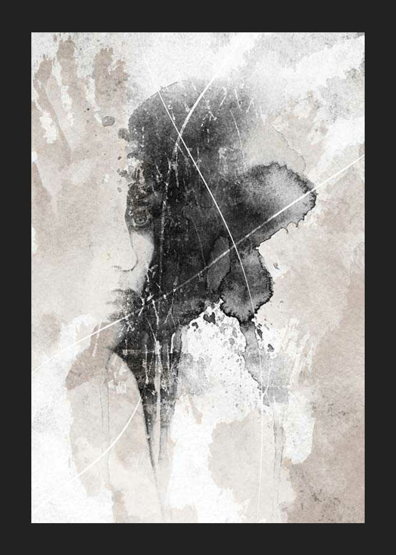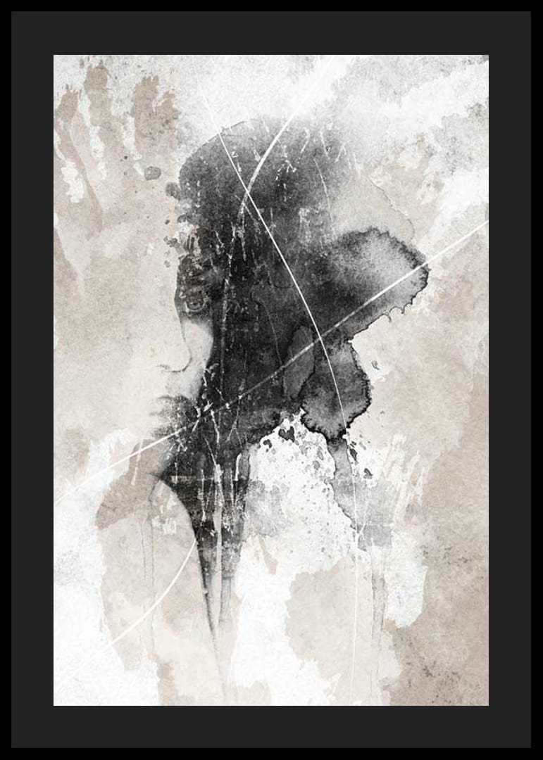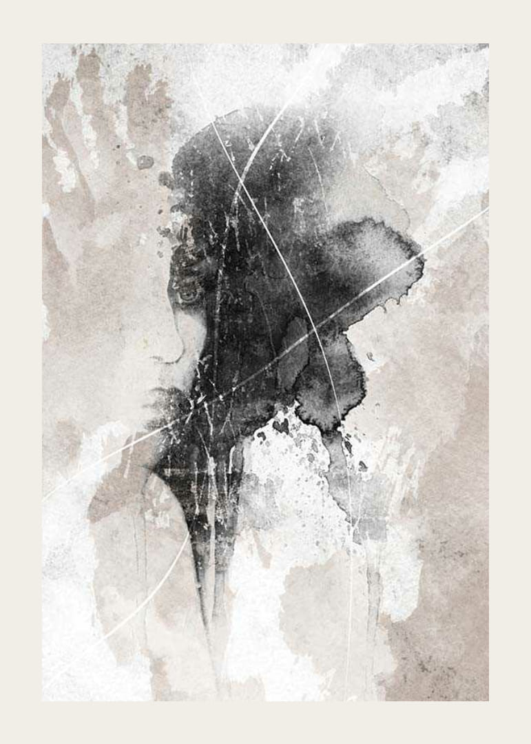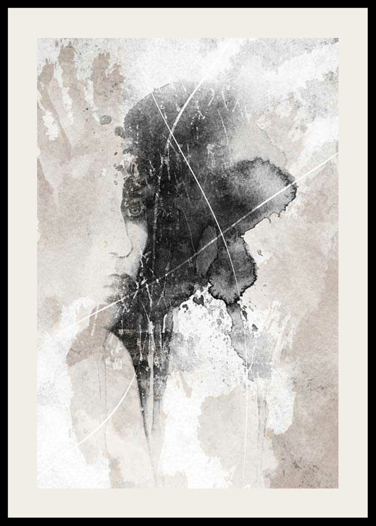 Motivet består av ett ansikte i profil, målat i svart akvarell mot en sandfärgad och ljus bakgrund med mjuka färgskiftningar. Vita linjer och handavtryck samspelar med de diffusa formerna och ger postern en konstnärlig, abstrakt stil. Passar i rum där en subtil och modern känsla eftersträvas.