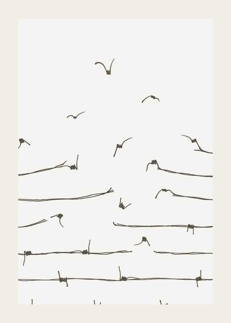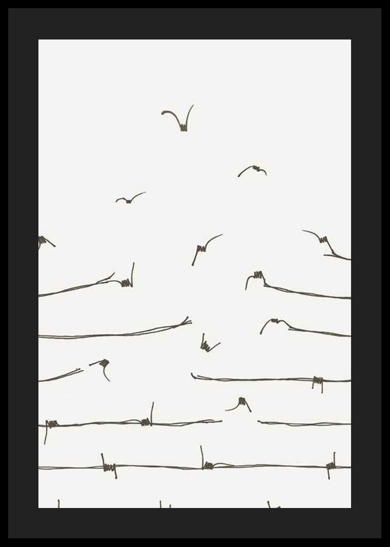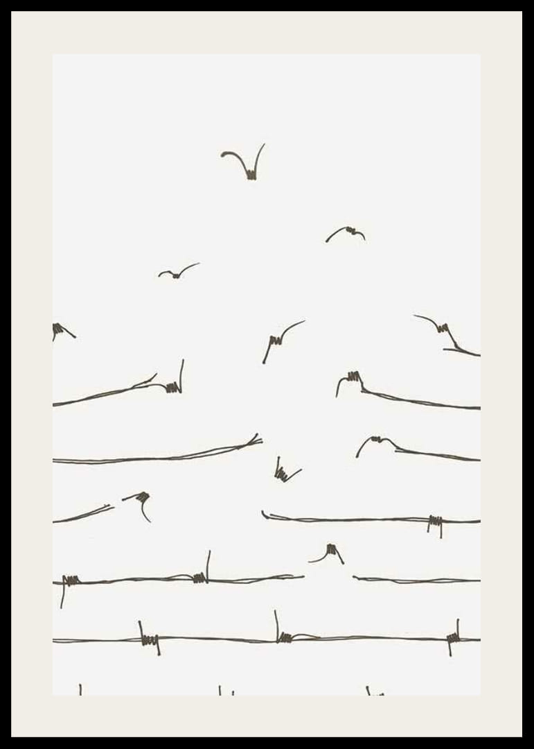 Motivet består av svart taggtråd tecknad med tunna linjer mot vit bakgrund, där delar av tråden löses upp och bildar siluetter av fåglar som flyger uppåt. Den kontrastrika, minimalistiska stilen ger postern en tydlig känsla av förändring och frihet. Passar i rum där ett eftertänksamt uttryck önskas.