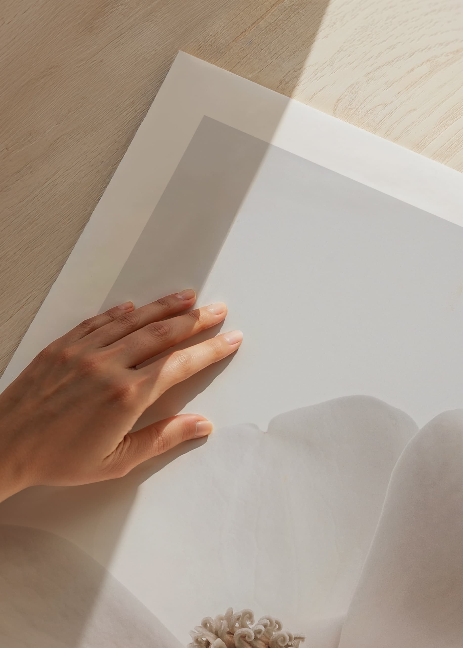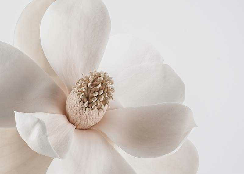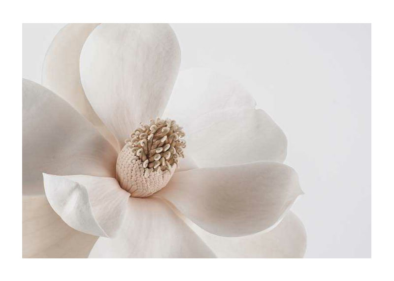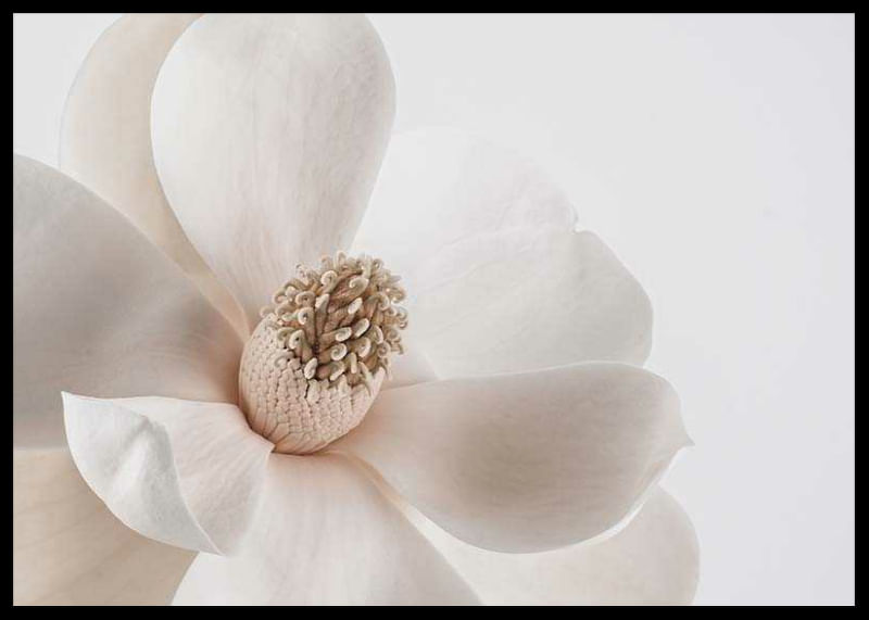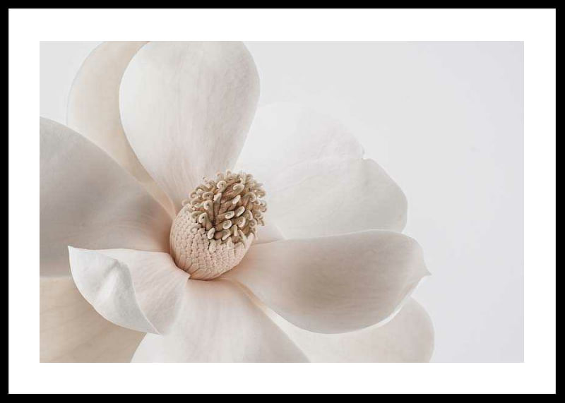Stora, mjuka kronblad i vitt och beige bildar en närbild av en magnoliablomma, där blommans centrum tydligt framhävs mot en enkel, ljus bakgrund. Avskalad och harmonisk känsla gör denna botaniska poster till ett subtilt inslag i vardagsrum, sovrum eller hall, och skapar en ljus vårkänsla i hemmet.