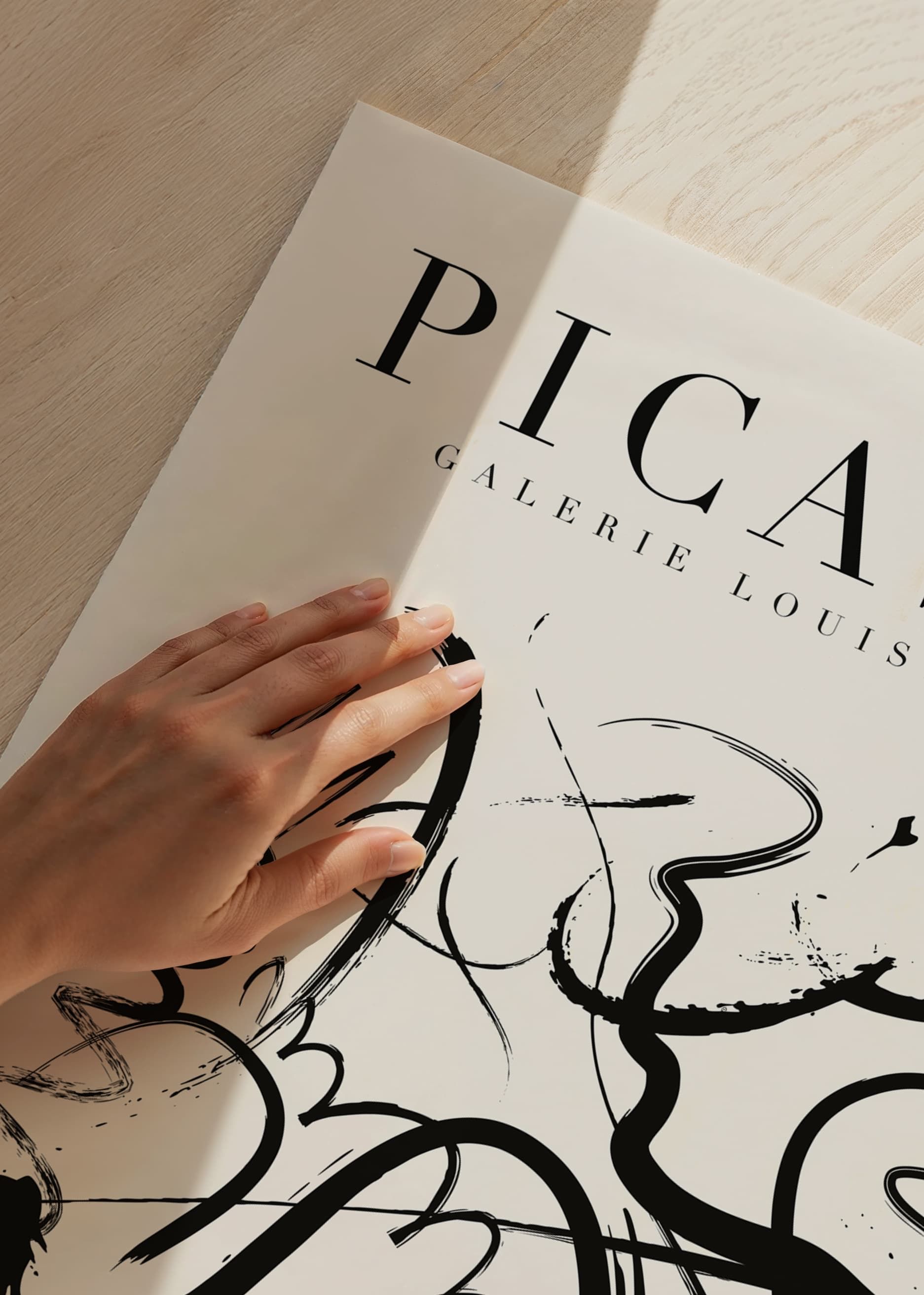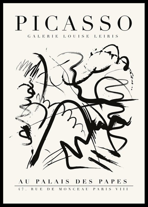 Abstrakta svarta penseldrag och lekfulla linjer breder ut sig mot en ljus beige bakgrund. Tydlig text med “Picasso” och utställningsdetaljer ramas in upptill och nedtill. Inspirerad av den spanske konstnären och en av 1900-talets mest inflytelserika konstnärer, Pablo Picasso, lyfter denna konstnärligt inspirerade poster fram ett grafiskt uttryck och passar i moderna rum där konstnärlig känsla står i fokus.