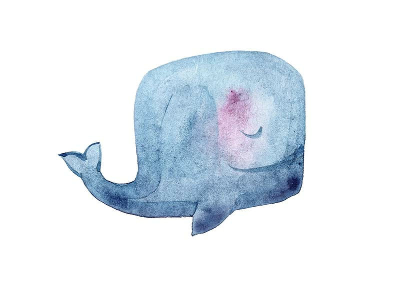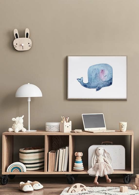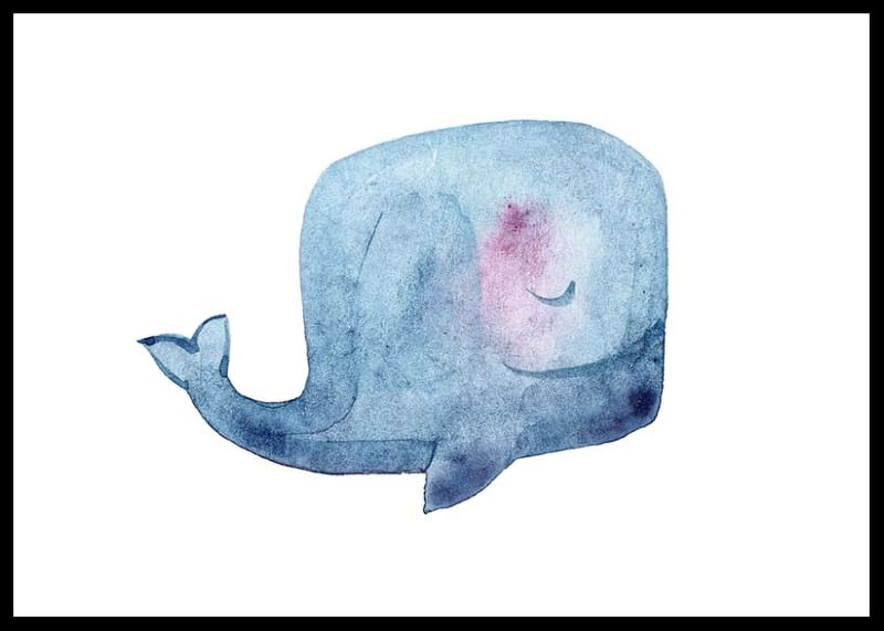 En blå val i mjuka akvarelltoner framträder mot en helt vit bakgrund. Valens kropp är enkel och stiliserad, med en ljusrosa kind och ett vänligt uttryck. Den minimalistiska kompositionen och de behagliga färgerna gör denna poster till ett roligt inslag i barnrummet eller lekhörnan.
