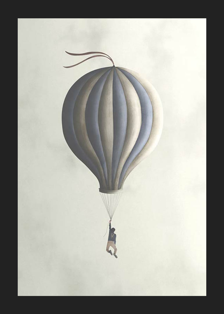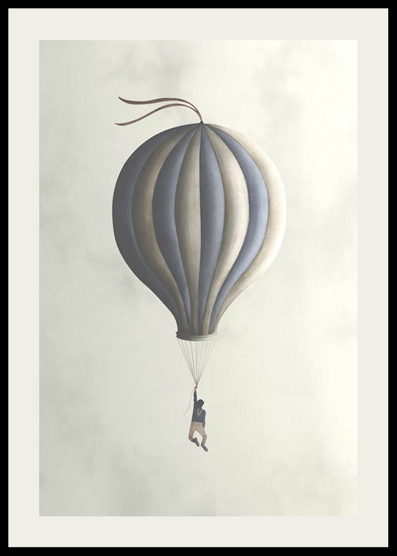 Motivet visar en man som hänger i repen under en stor luftballong mot en ljus, disig bakgrund. Mjuka grå och blå nyanser ger en lugn och drömsk känsla, medan den enkla kompositionen ger mycket utrymme åt fantasin. Denna poster passar fint i barnrum eller kreativa miljöer och bidrar med ett lättsamt, konceptuellt uttryck.