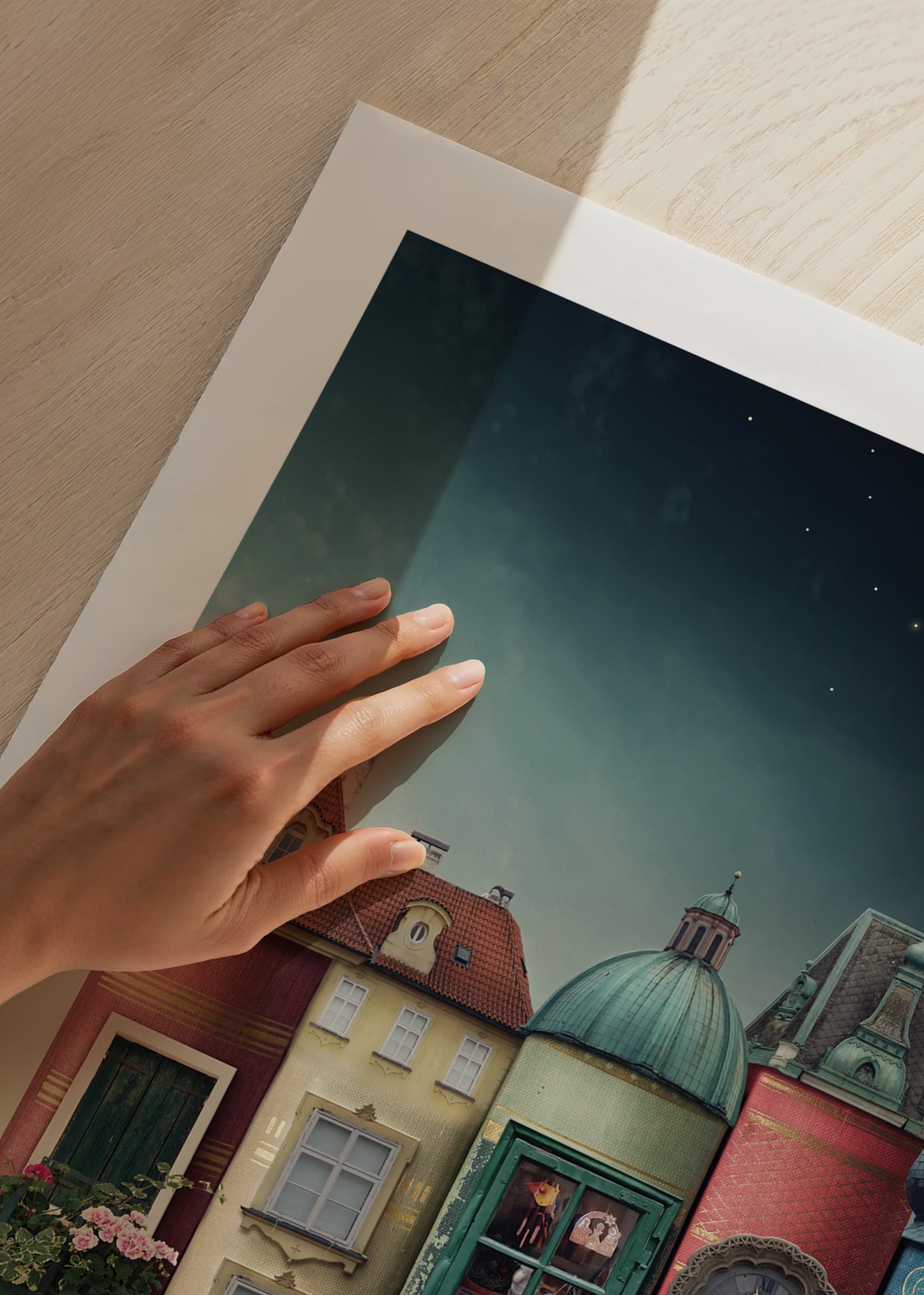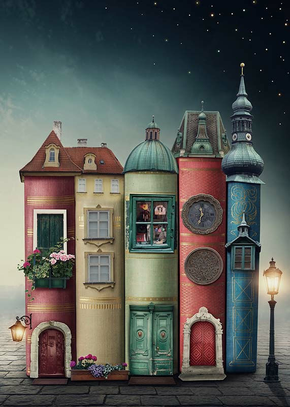 Fantasifulla hus uppbyggda av staplade böcker med dörrar, fönster och torn i mjuka rödgröna och blå toner. Motivet ramas in av en stjärnklar natthimmel och gatlyktor på kullerstensgata. Den här poster ger barnrummet en lekfull känsla och stimulerar fantasin med sina detaljrika och sagoliknande inslag.