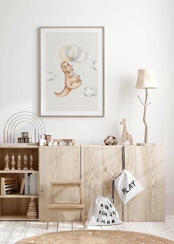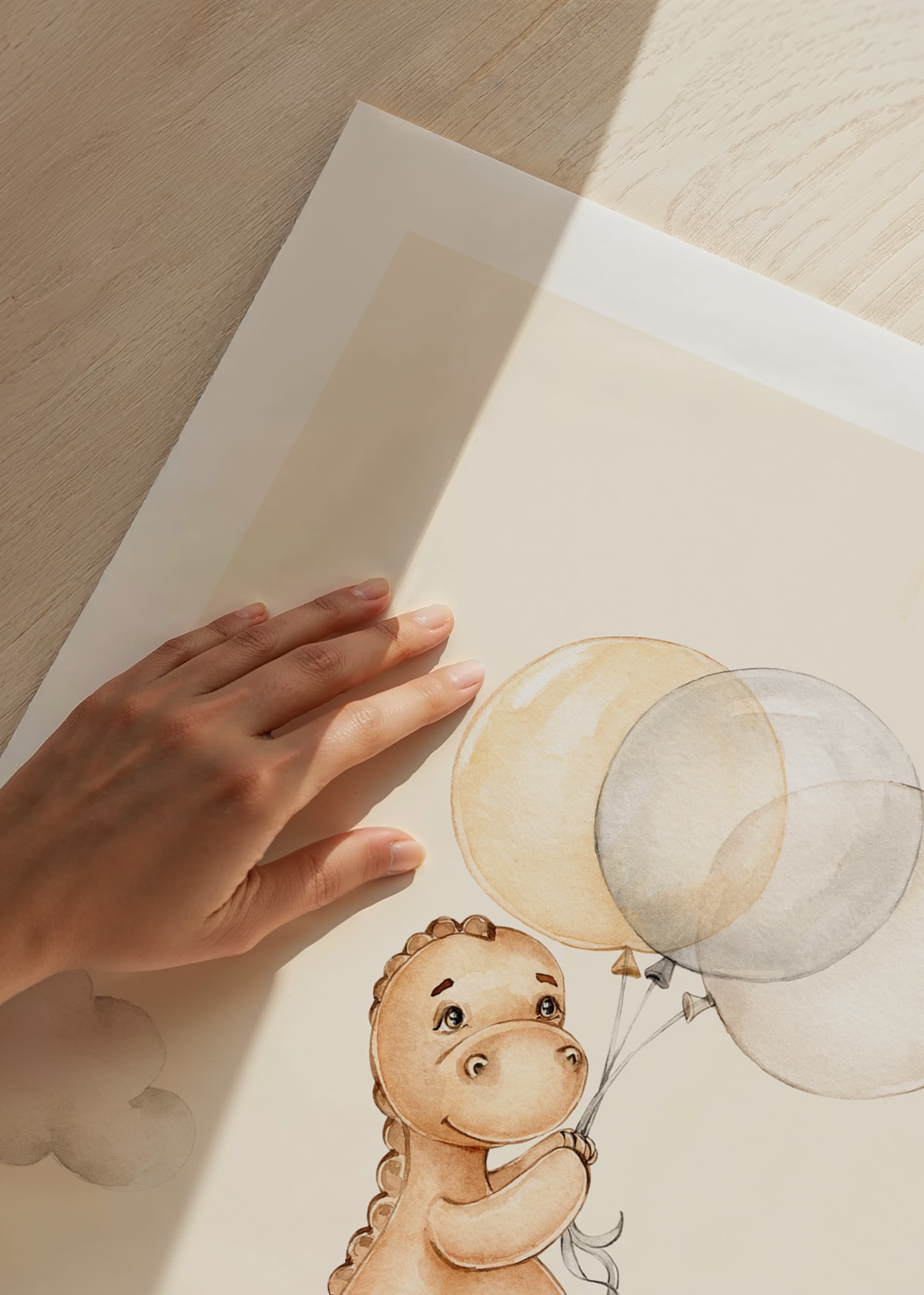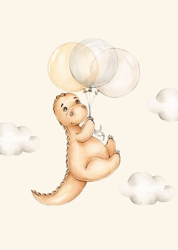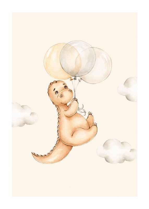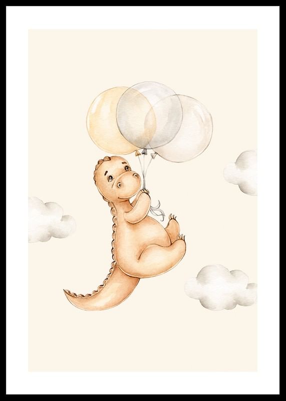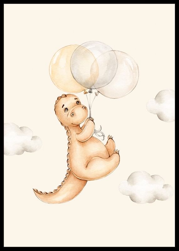 Motivet består av en tecknad ljusbrun dinosaurie som flyger högt bland fluffiga vita moln, upplyft av tre ballonger i dova beige och grå toner. Den sandfärgade bakgrunden ger ett lugnt intryck och illustrationen har mjuka akvarellinslag. En lekfull poster som tillför värme och fantasi till barnrummet.