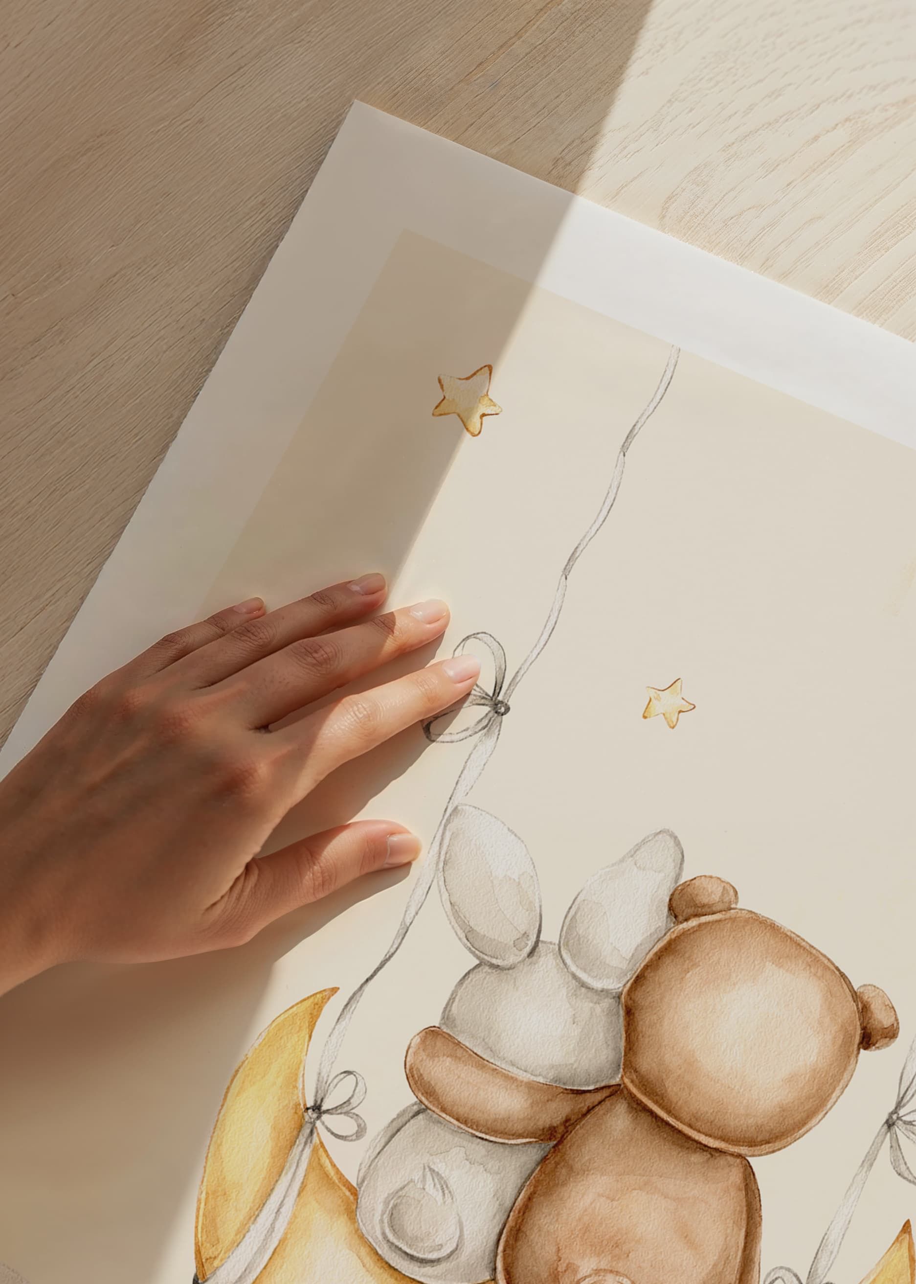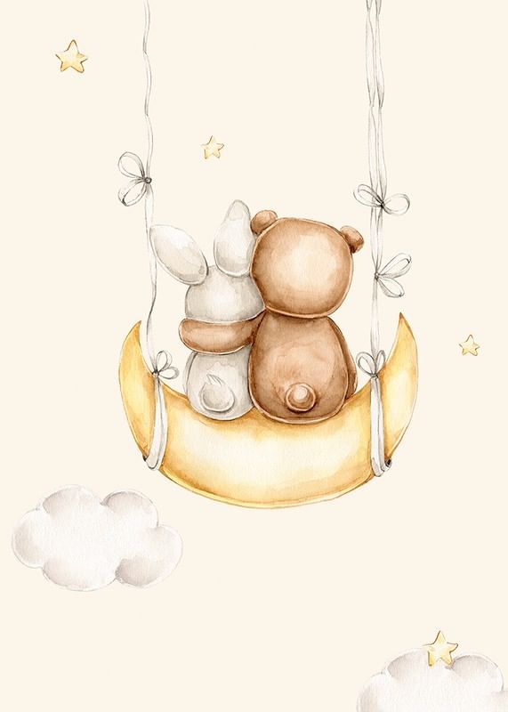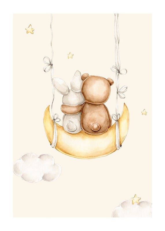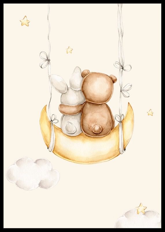 Två gosiga figurer, en beige kanin och en brun björn, sitter tätt intill varandra på en gunga formad som en halvmåne. Motivet omges av små stjärnor och mjuka moln på en ljus, sandfärgad bakgrund. Denna poster med milda färger tillför en vänlig och lugn känsla i barnrummet eller lekhörnan.