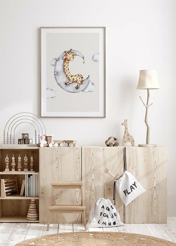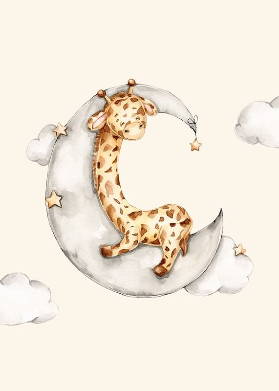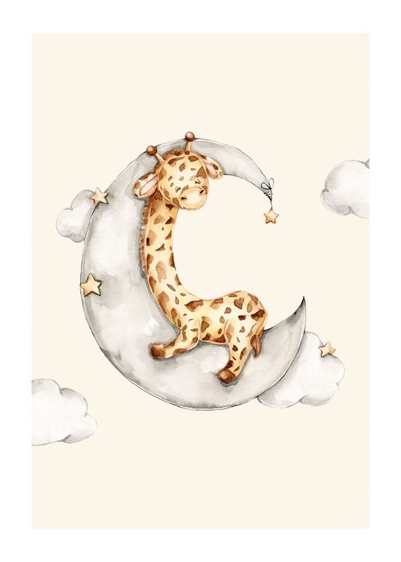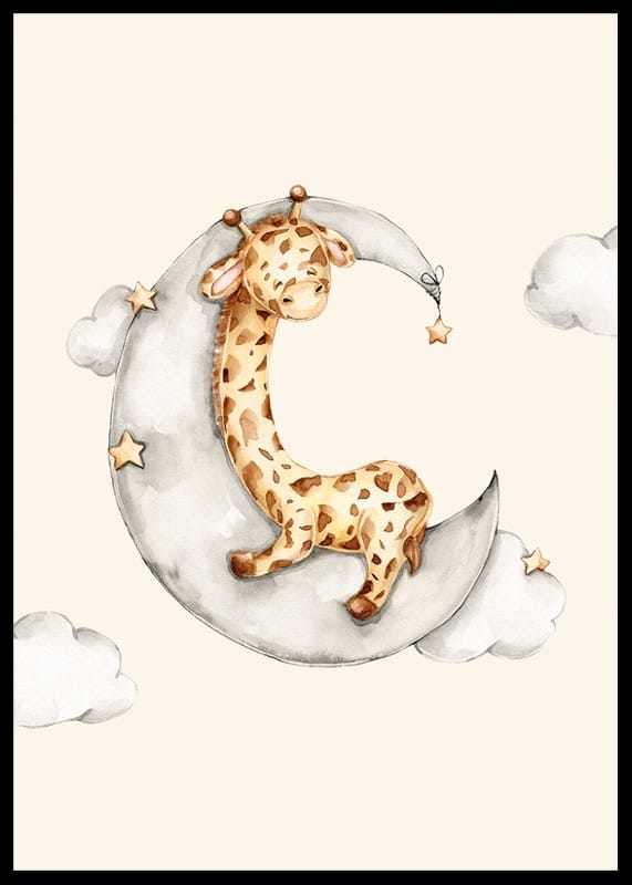 En liten giraff ligger sovande på en grå månskära, omgiven av mjuka moln och små stjärnor mot en sandfärgad bakgrund. Den lekfulla akvarellstilen och dämpade färgpaletten gör denna poster till ett lugnt tillskott i barnrummet eller i en hörna där en mjuk och vänlig atmosfär önskas.