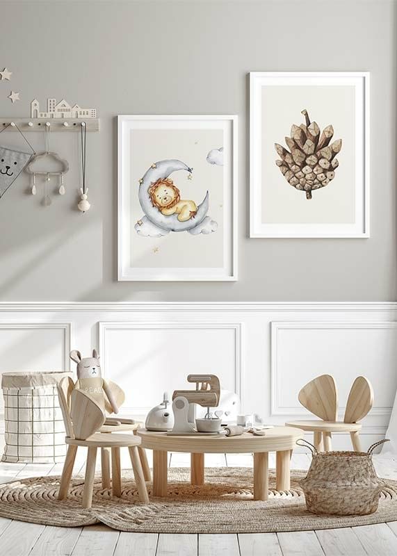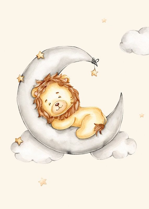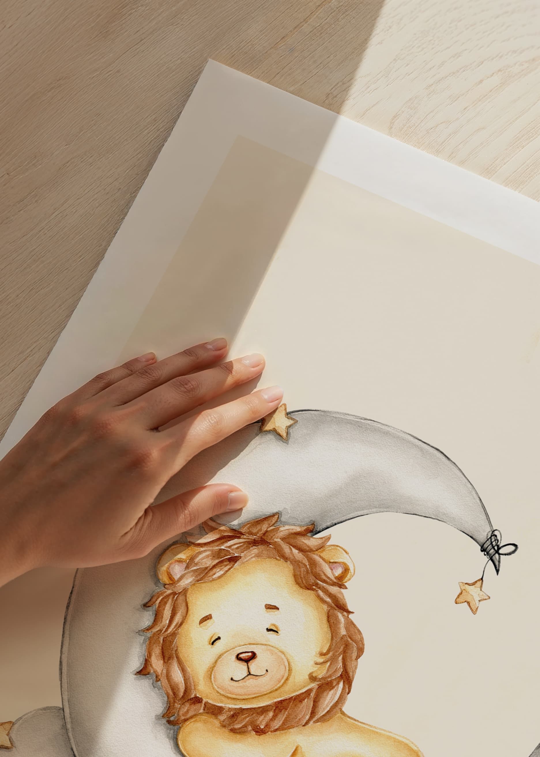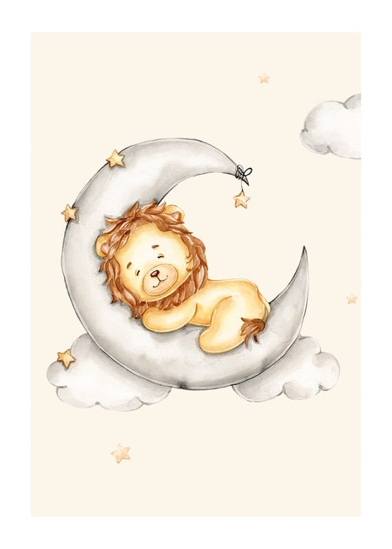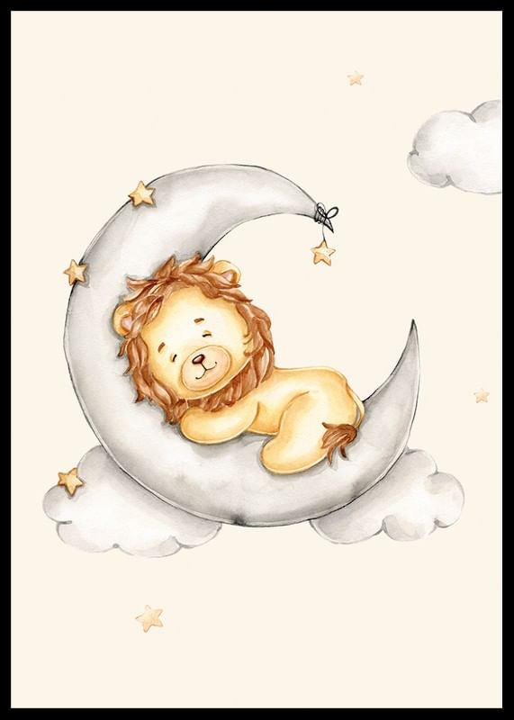 En lejonunge med brunt man ligger och sover på en ljusgrå månskära, omgiven av små moln och stjärnor mot en varm beige bakgrund. Mjuka färgövergångar och lekfulla detaljer gör denna poster till ett fint inslag i barnrummet, där den skapar en vänlig och drömsk atmosfär i inredningen.