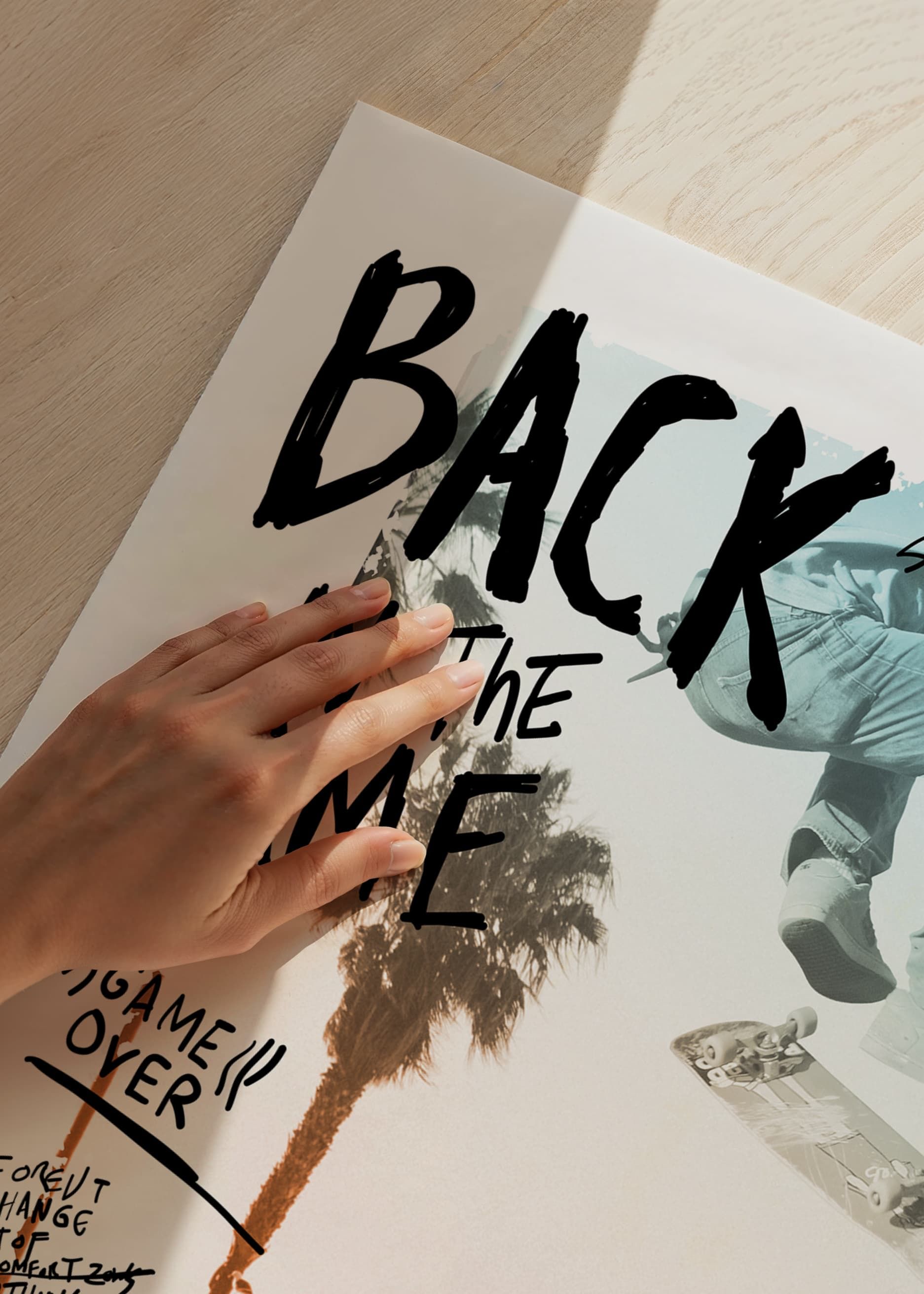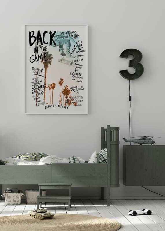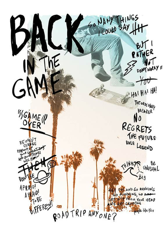 En skateboardåkare utför ett trick högt ovanför svajande palmer mot en ljus bakgrund i dämpade pastelltoner. Omgivna av handskrivna budskap och peppande fraser skapas en energifylld och lekfull känsla. Den här postern gör sig bra i ungdomsrum eller kreativa miljöer där inspiration står i centrum.