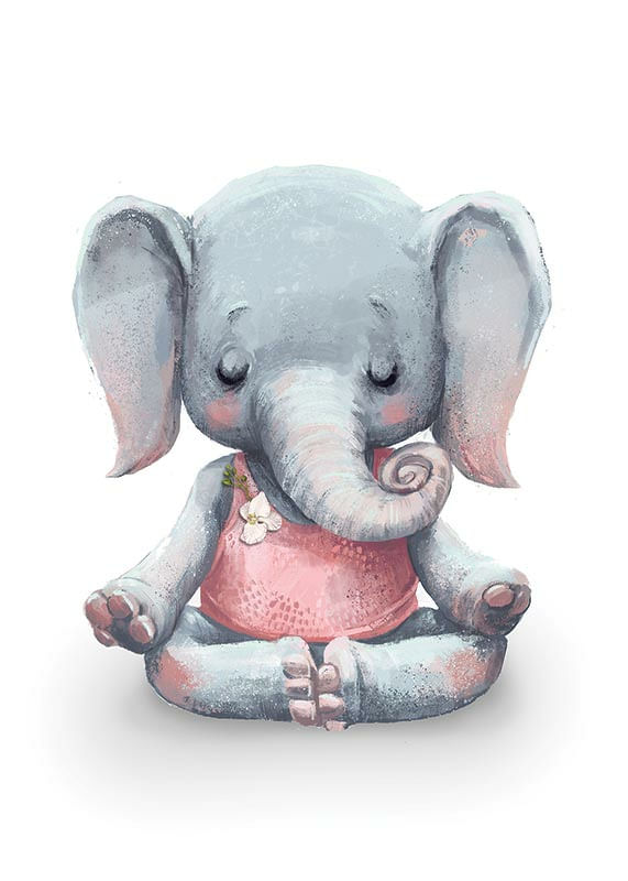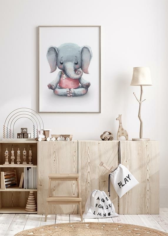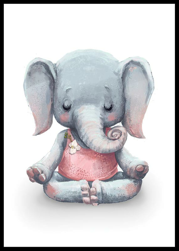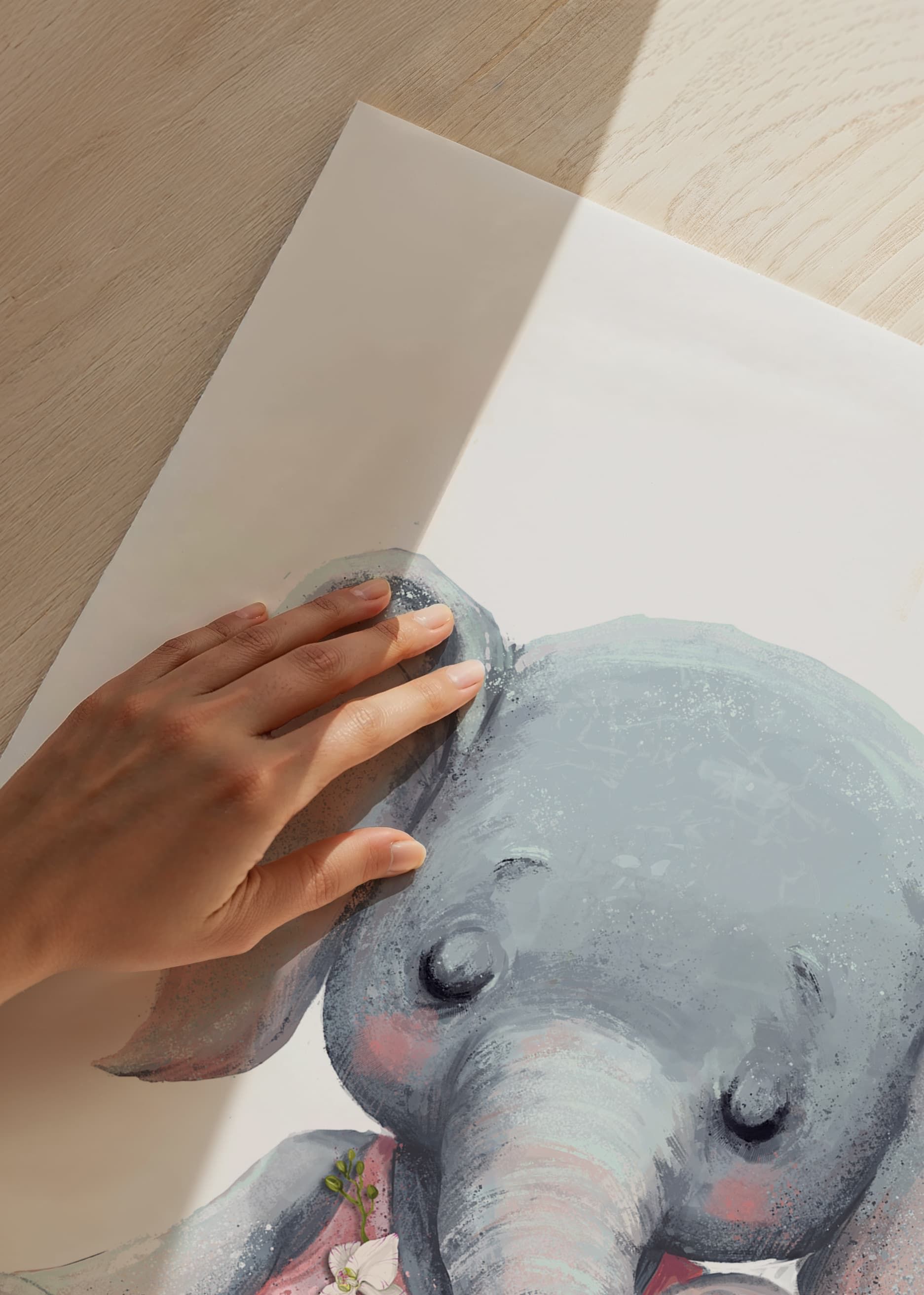 En sittande elefantunge med slutna ögon och lindad snabel syns mot vit bakgrund. Gråblå, mjuka toner möter detaljer i rosa på elefantens tröja och ett litet blommotiv vid ena axeln. Denna poster förmedlar ett lugnt uttryck och passar lika bra i barnrum som i andra miljöer där en lekfull ton önskas.