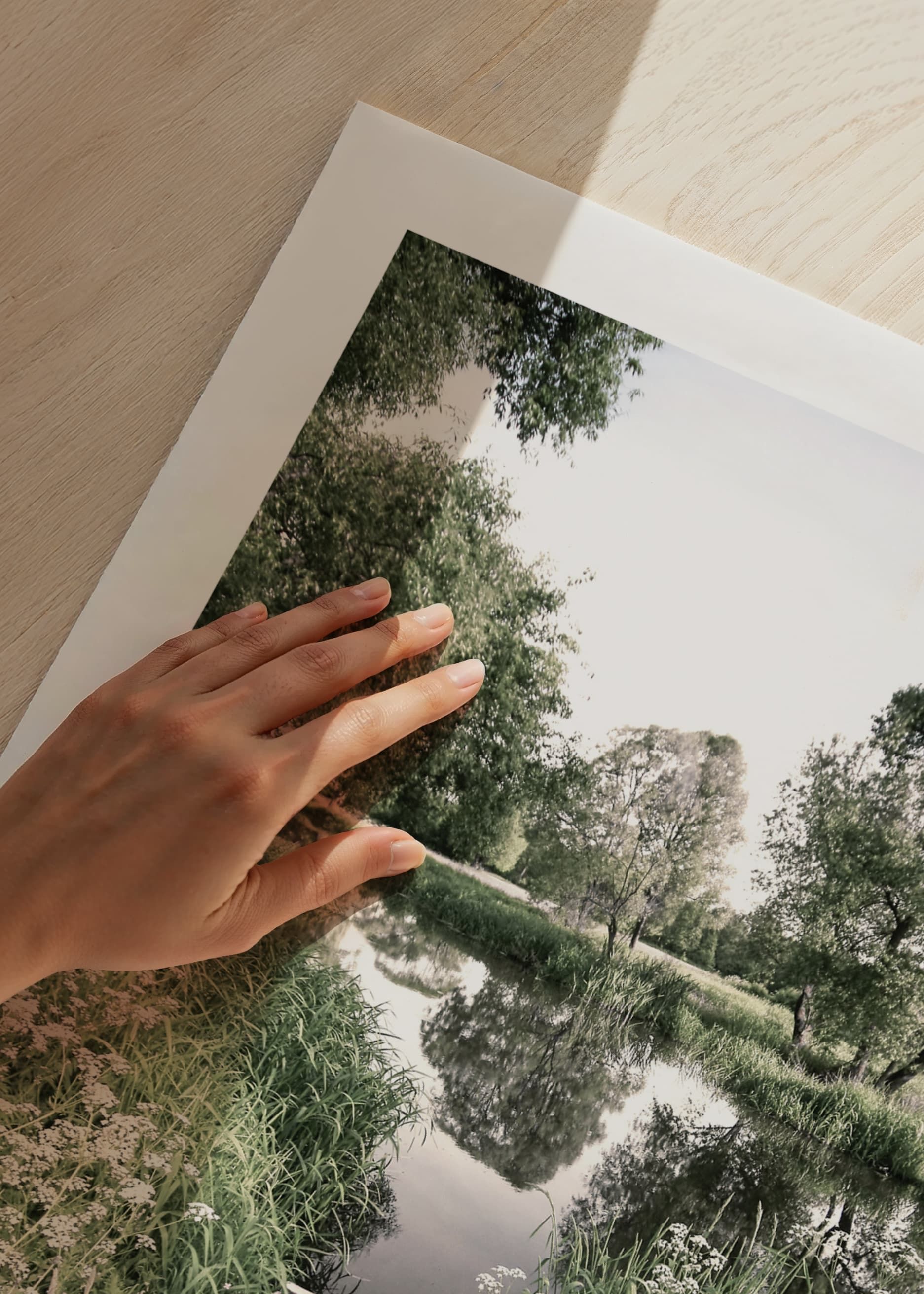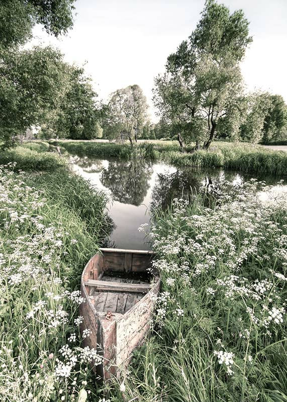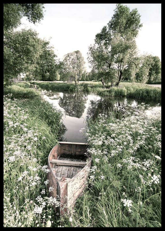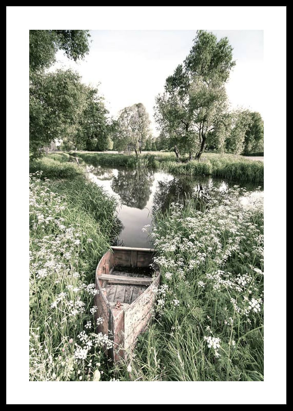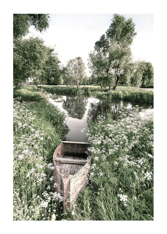 En sliten träbåt vilar halvt gömd i frodigt sommargräs vid kanten av en stilla å. Vattnet speglar himlen och omgivande träd, medan vita blomster breder ut sig runt båten. Denna poster blir ett naturnära inslag i hemmet och passar särskilt bra i rum där en avkopplande atmosfär önskas.