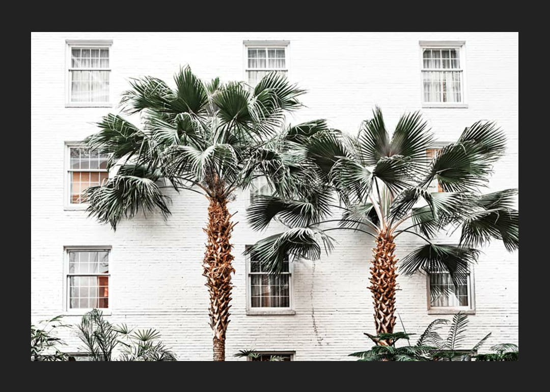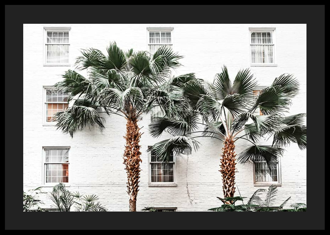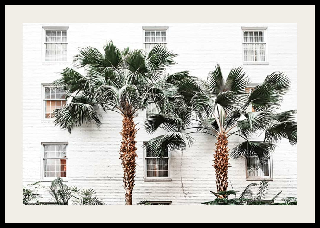 Två frodiga palmer reser sig mot en stor vit byggnad med stora fönster, där ljuset skapar kontrast mellan det gröna och byggnadens ljusa yta. Stadskänsla möter tropiska former i denna poster, som lyfter fram arkitektur och natur i samspel. Passar både i modernt vardagsrum eller kontor.