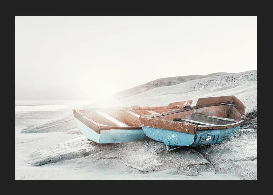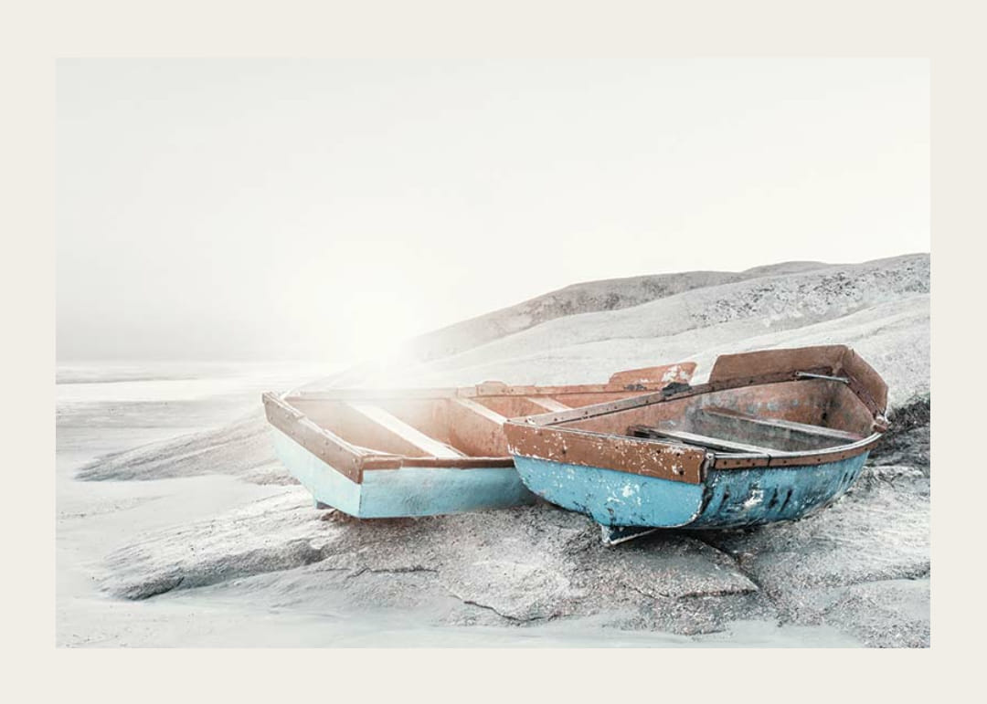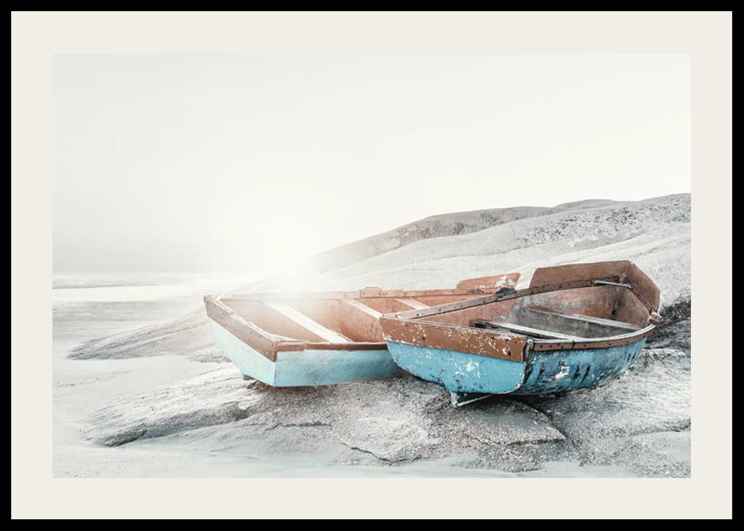 Två slitna roddbåtar i blå och bruna toner vilar på ljusa klipphällar vid strandkanten. Morgonljuset strömmar in från vänster och skapar milda kontraster mot den disiga bakgrunden. Den här poster ger en ljus och avskalad känsla till rum som vardagsrum, hall eller sommarhus.
