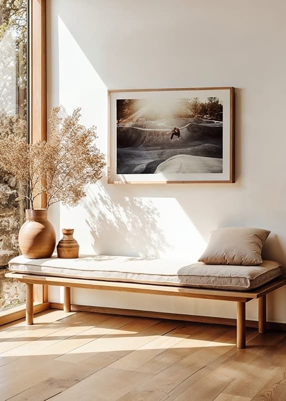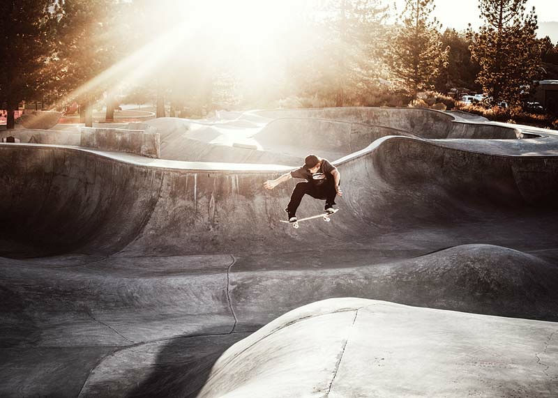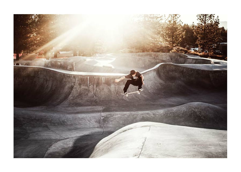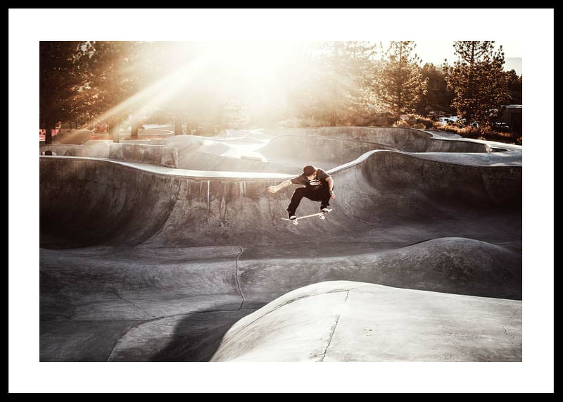En skateboardåkare fångas mitt i ett hopp över de mjuka kurvorna i en stor betongpark. Solljuset strömmar in bakifrån och skapar dramatiska skuggor och ljusa partier över landskapet. Med sin energiska rörelse ger motivet i denna poster en urban känsla som passar i ungdomsrum, hall eller vardagsrum.