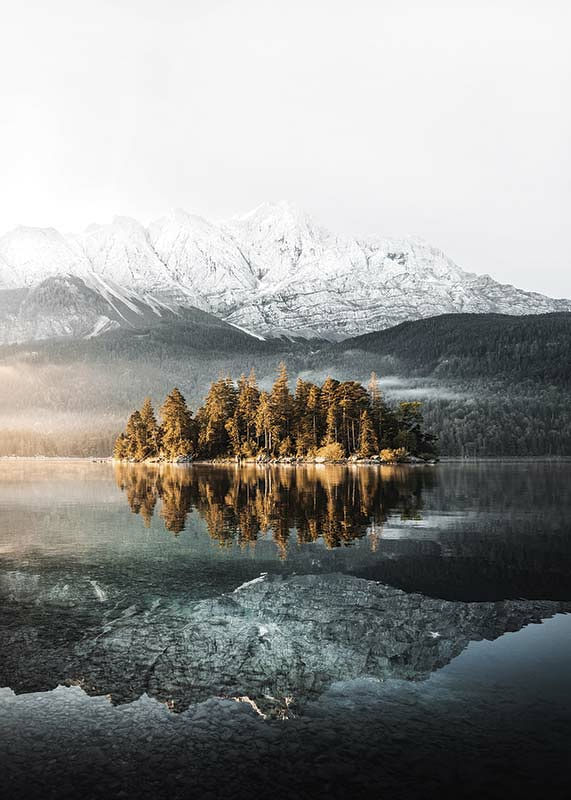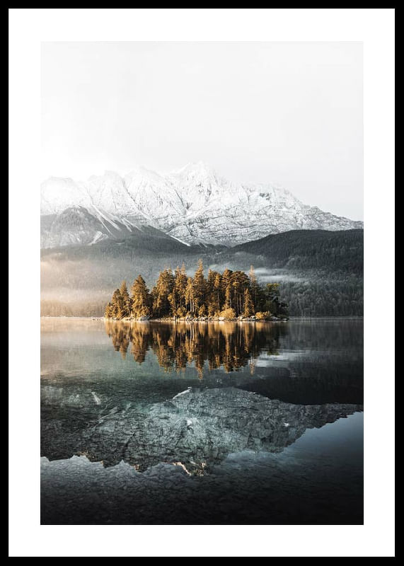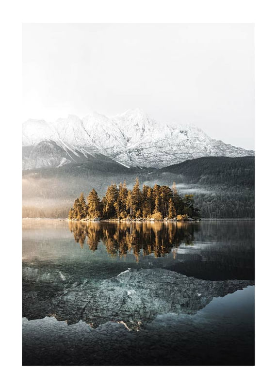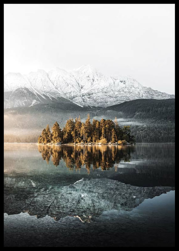 En tät granskog täcker en liten ö som speglas i en stilla sjö. I bakgrunden reser sig snötäckta berg under en ljus vinterhimmel, medan skogens varma toner kontrasterar mot det kyliga landskapet. Denna poster ger ett stämningsfullt naturmotiv som fungerar lika bra i vardagsrum som i arbetsrum.
