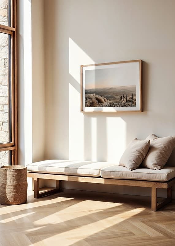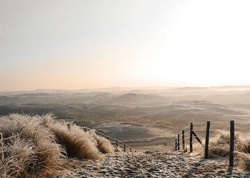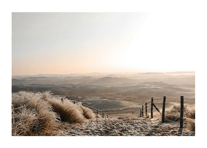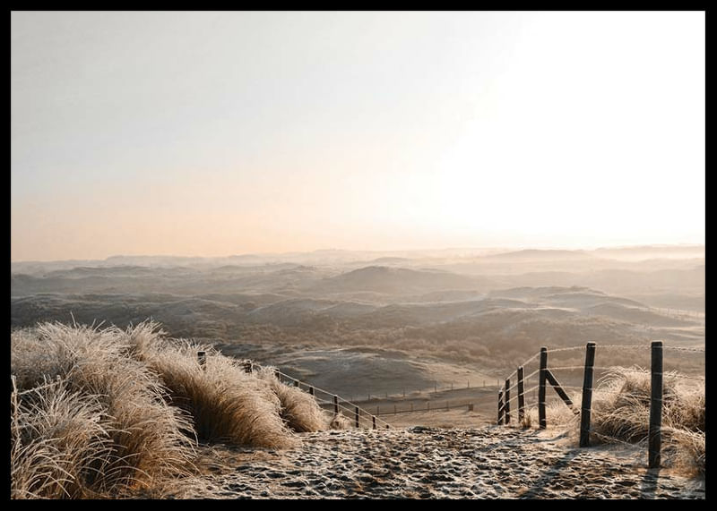Frostklädda grässtrån och sanddyner sträcker ut sig mot horisonten under ett blekt morgonljus. En smal stig kantad av trästolpar leder blicken in i det vidsträckta landskapet. Subtila beige och grå toner dominerar motivet och skapar en lugn atmosfär. Denna poster passar utmärkt i rum där naturens enkelhet uppskattas.