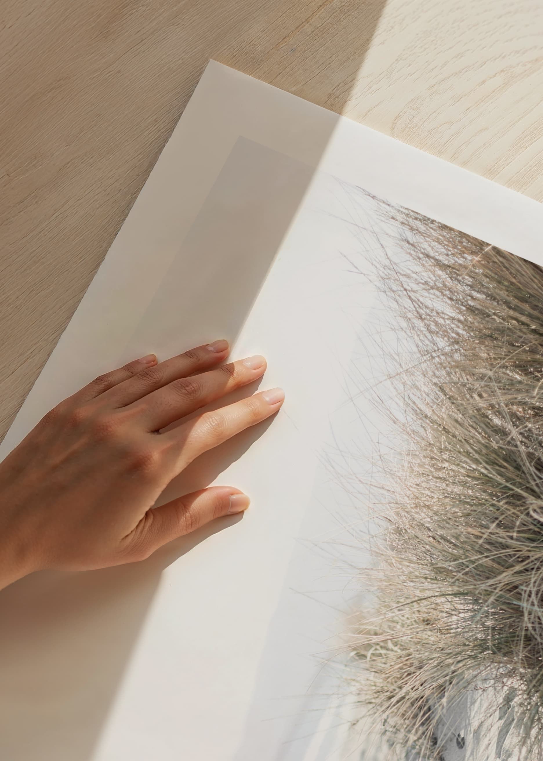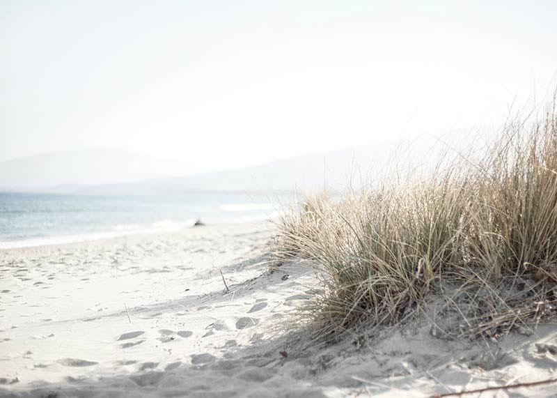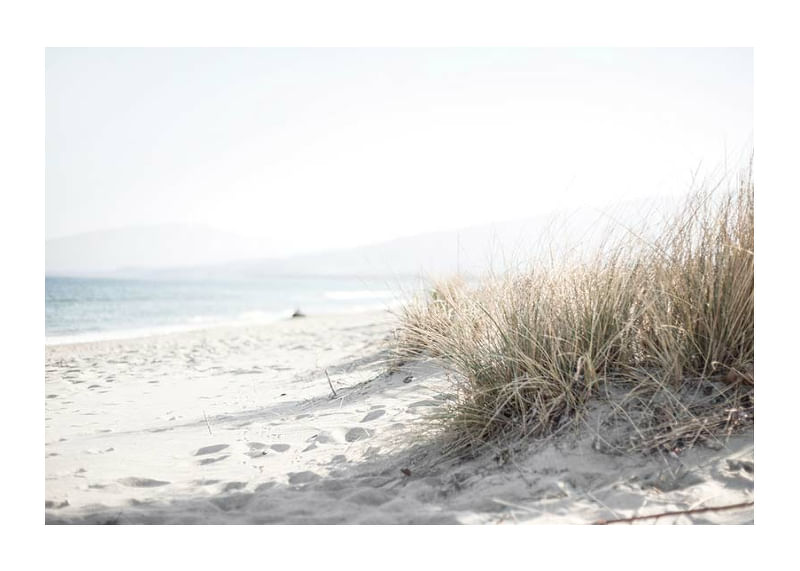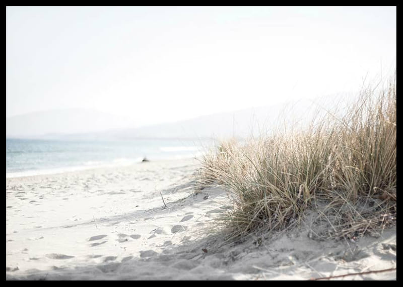 Strandråg växer i förgrunden på en solbelyst sandstrand med havet synligt till vänster och disiga berg i bakgrunden. Ljusa, naturliga färgtoner skapar en luftig och somrig känsla. Denna poster ger en stillsam påminnelse om kustlandskap och passar i såväl vardagsrum som sovrum.