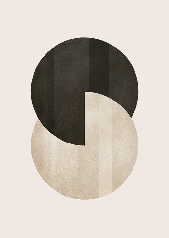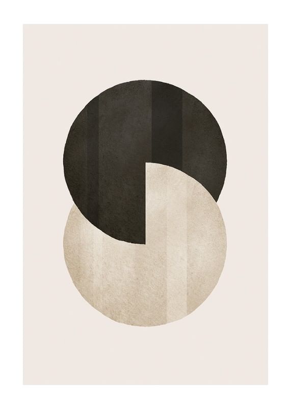 Två grafiska cirklar, en svart och en beige, överlappar varandra mot en ljus sandfärgad bakgrund. Milda färgskiftningar och enkla geometriska former ger ett stilrent uttryck. Denna poster passar bra i moderna hem och tillför en subtil, grafisk känsla till exempelvis vardagsrum eller kontor.