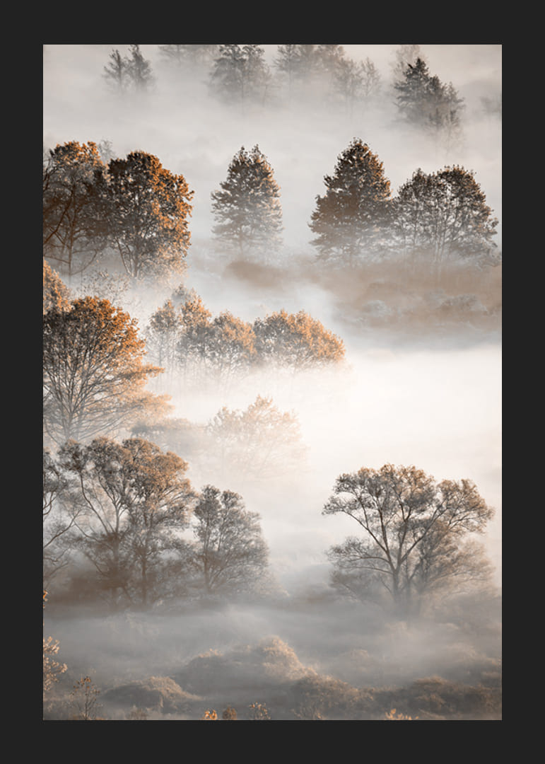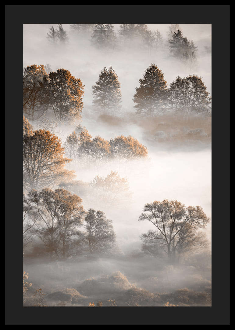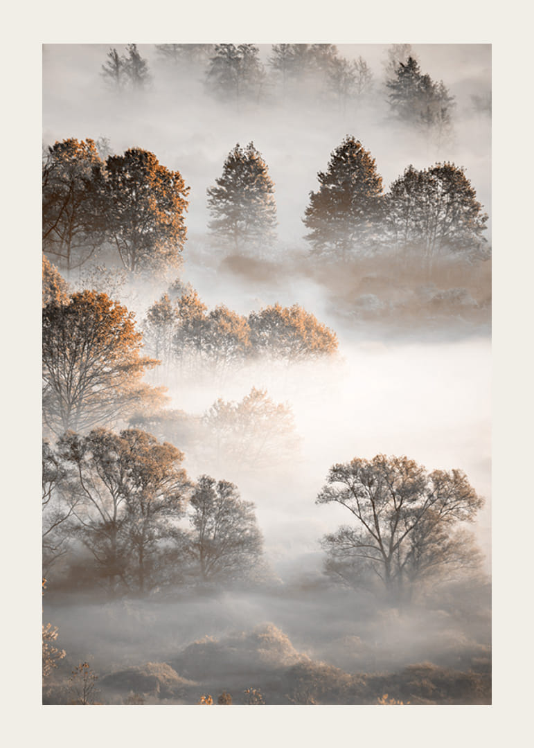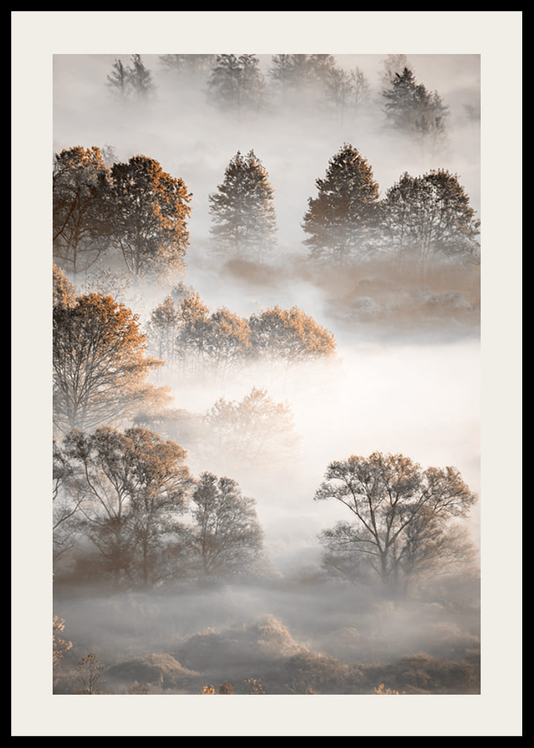 Siluetter av höstträd i gyllene toner breder ut sig över ett landskap täckt av mjuk, tät morgondimma. Bilden är tagen ovanifrån och fångar kontrasten mellan varma gulbruna löv och det ljusa diset. Denna poster förmedlar ett stilla, naturligt intryck och fungerar väl i rum där lugn atmosfär önskas.