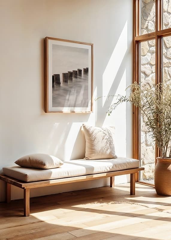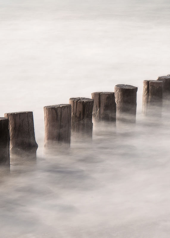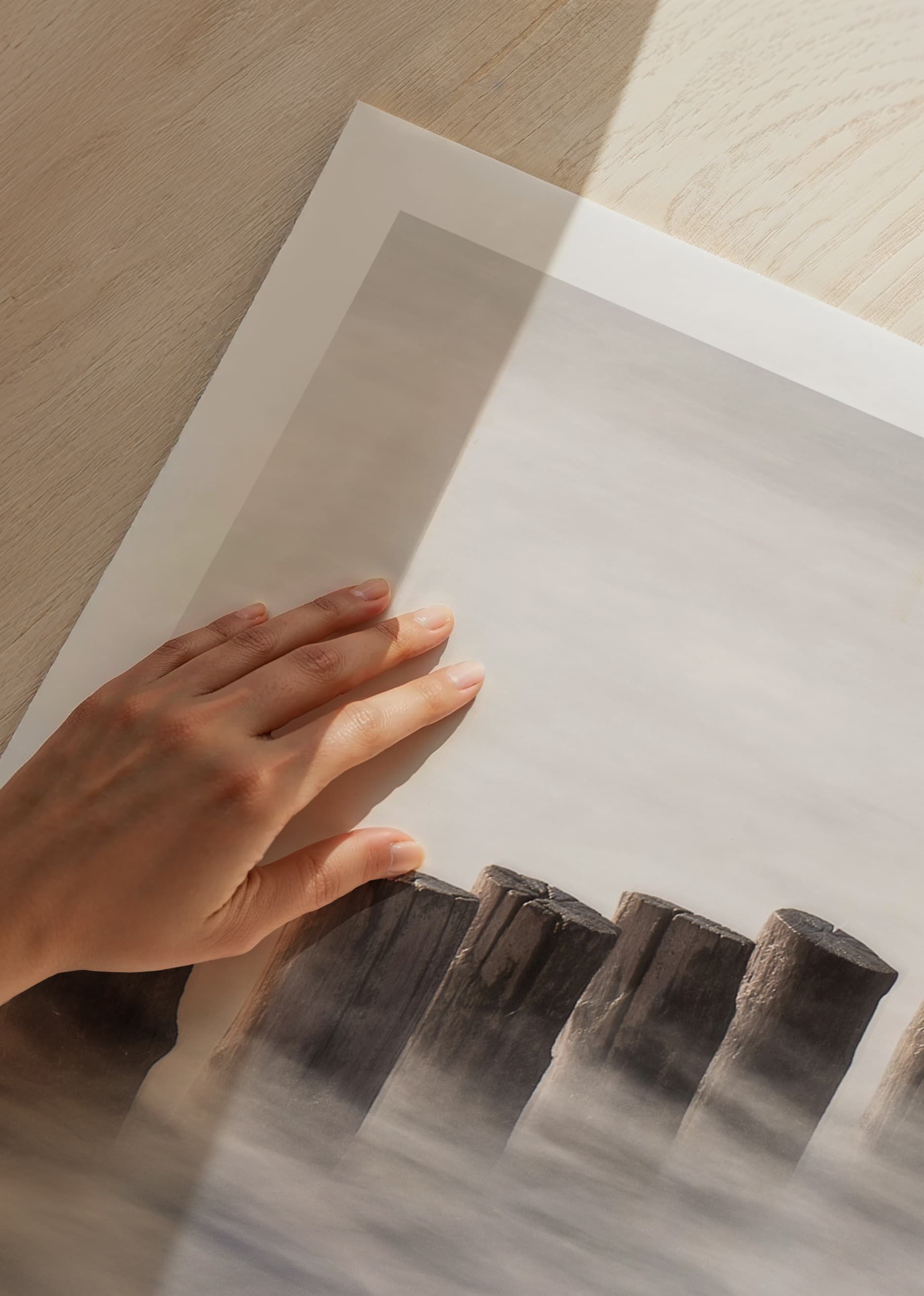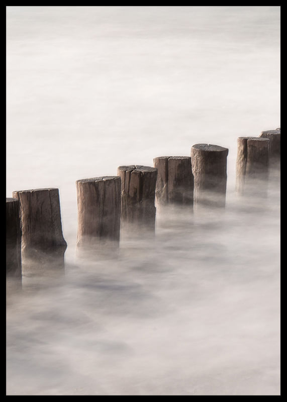 Linje av grova träpålar reser sig ur ett disigt hav, insvepta i tät dimma med mjuka konturer i grå och bruna nyanser. Denna poster fångar det subtila mötet mellan naturens kraft och stillhet och skapar ett lugnt blickfång. Passar bra i vardagsrum eller arbetsrum för en rogivande atmosfär.