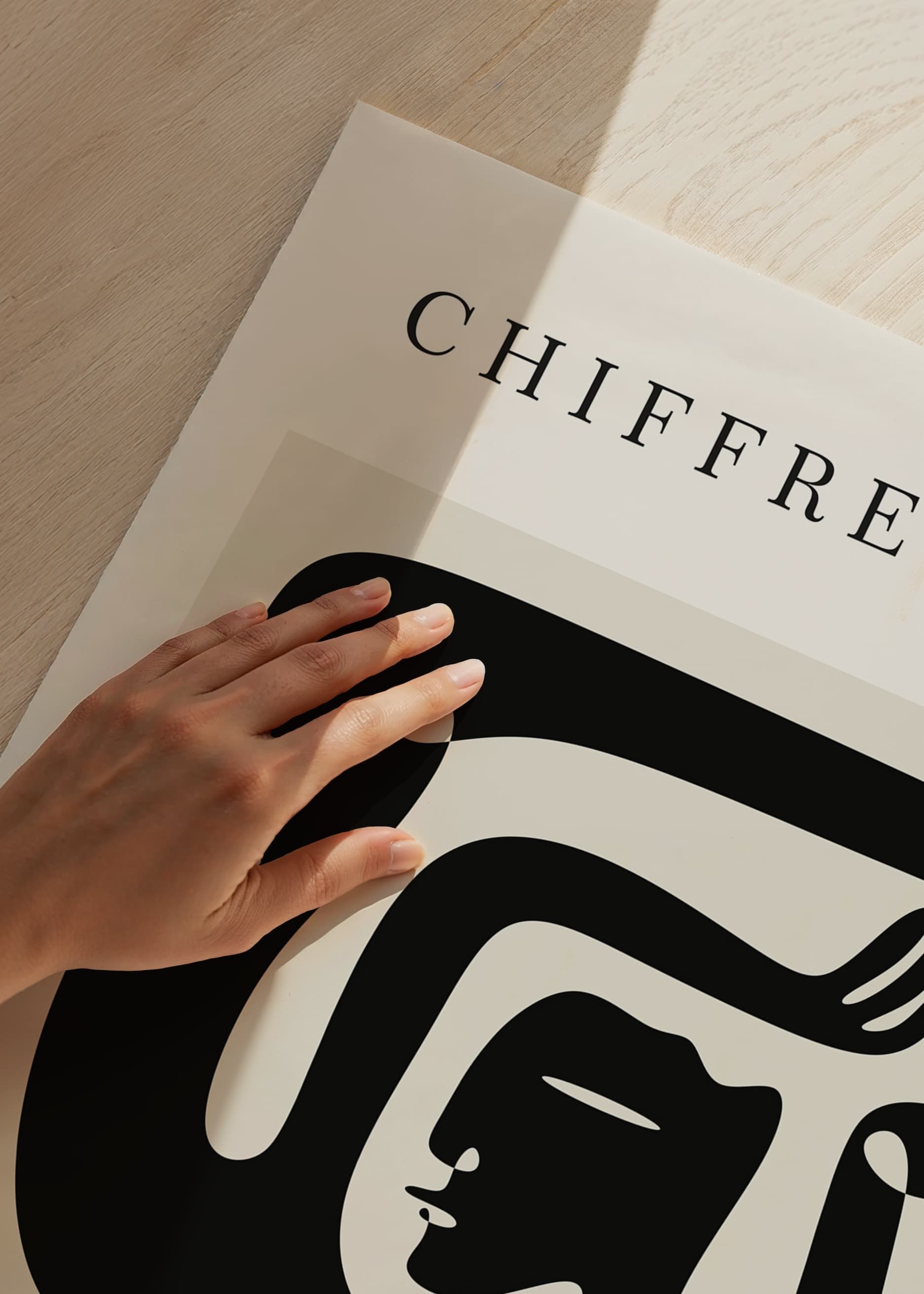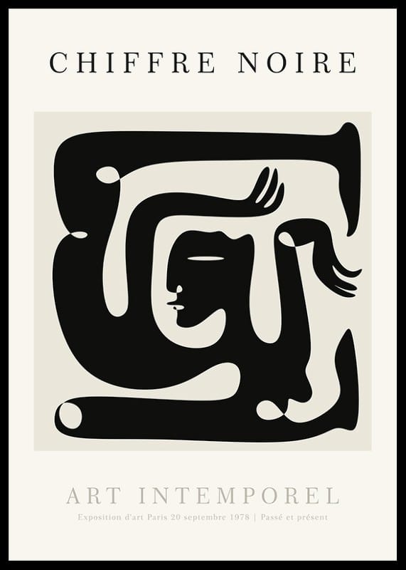 Grafiska former i svart bildar ett stiliserat ansikte och konturer av en kropp mot ljus beige bakgrund. Motivet har en minimalistisk och modern känsla som gör att postern passar i både vardagsrum och arbetsmiljö. Den neutrala färgskalan ger flexibilitet för varierande inredningsstilar och rum.