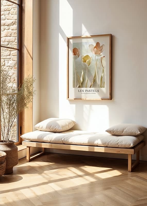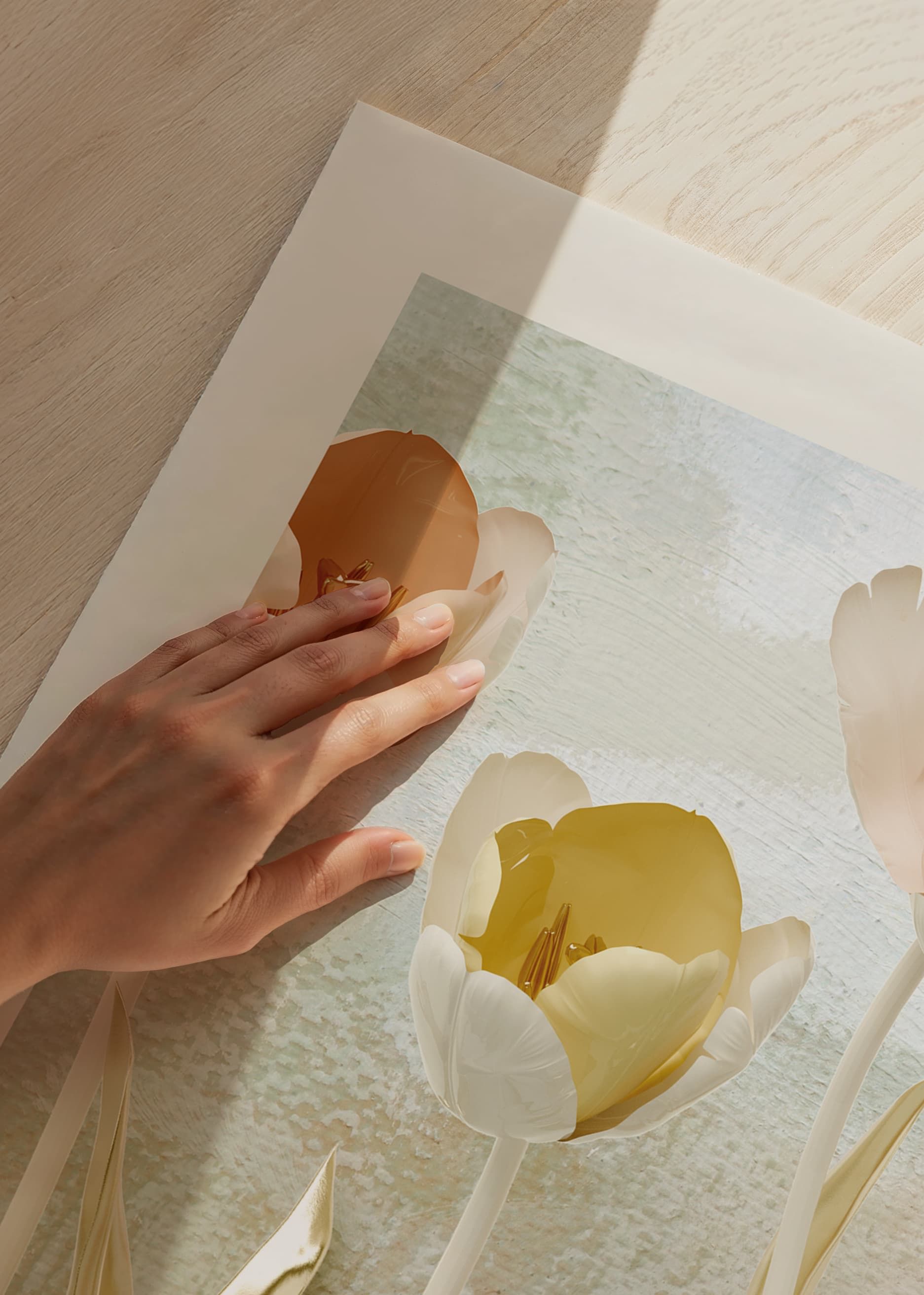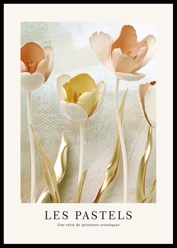 Motivet består av stiliserade tulpaner i dämpade pastelltoner som aprikos, gult och cremevitt. De avlånga, svagt glänsande bladen återges i ljusa, guldfärgade nyanser mot en subtil, ljus bakgrund. Denna poster lyfter fram vårens skira känsla och passar i vardagsrum eller hall.