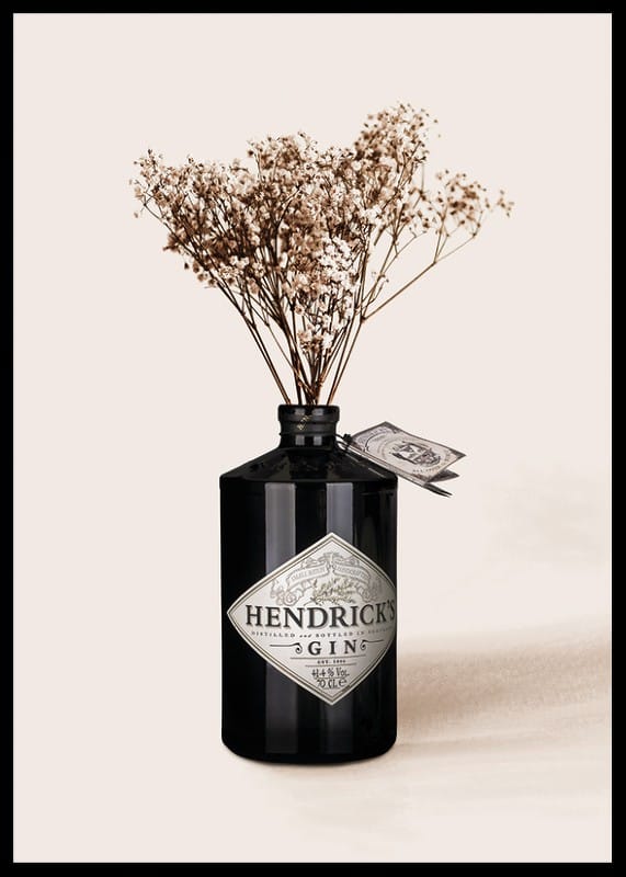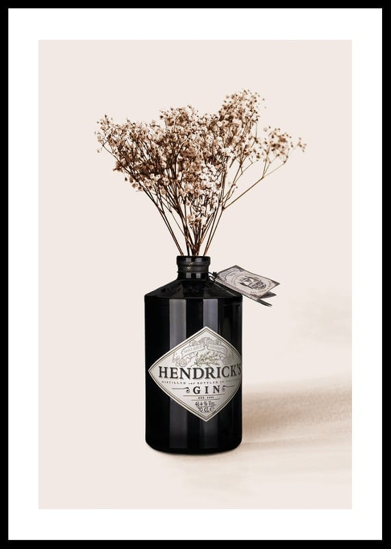 Motivet består av torkade beige blommor arrangerade i en mörk Hendrick’s Gin-flaska mot en enkel ljus bakgrund. Den neutrala paletten ger ett stilrent intryck medan den botaniska känslan skapar en varm atmosfär. Postern passar särskilt bra i kök eller vardagsrum för en diskret, höstinspirerad detalj.