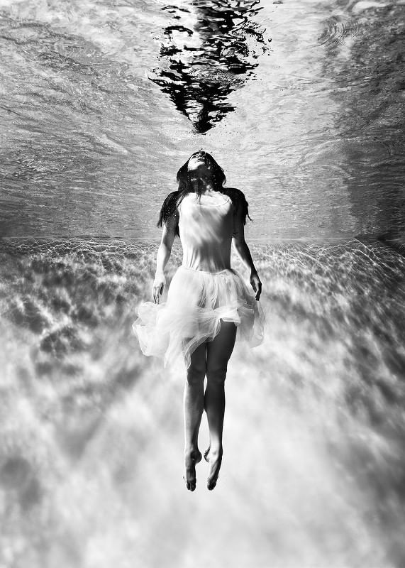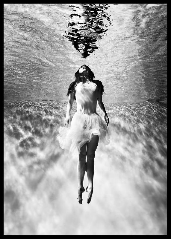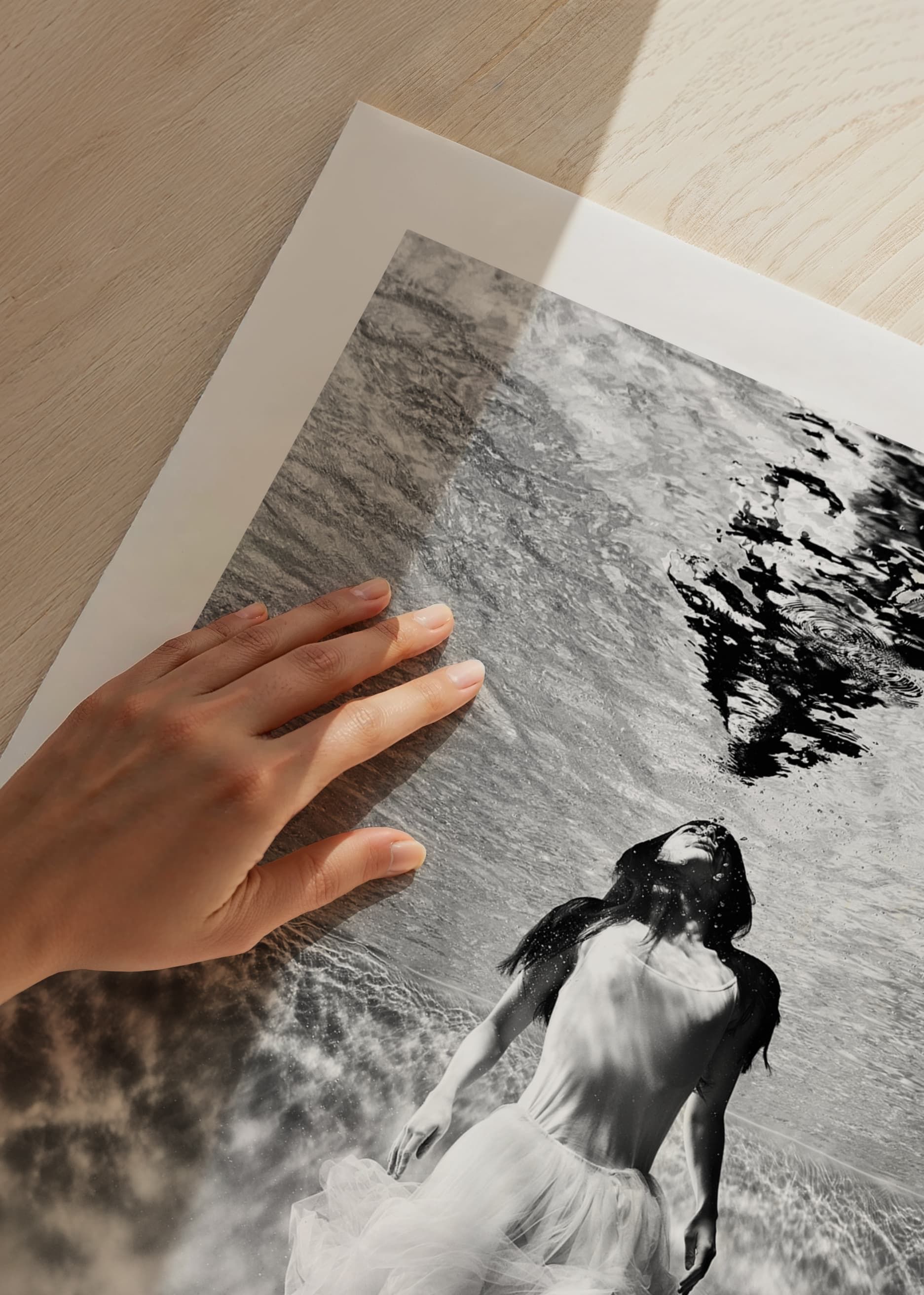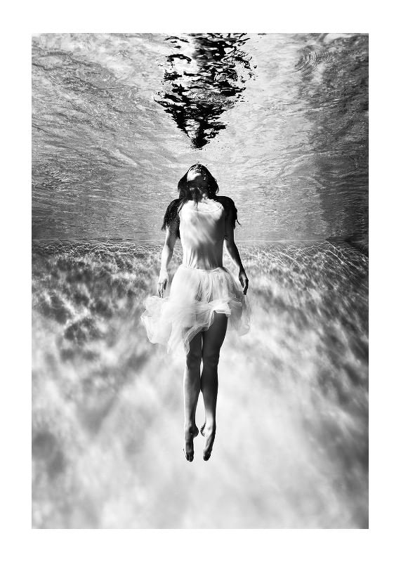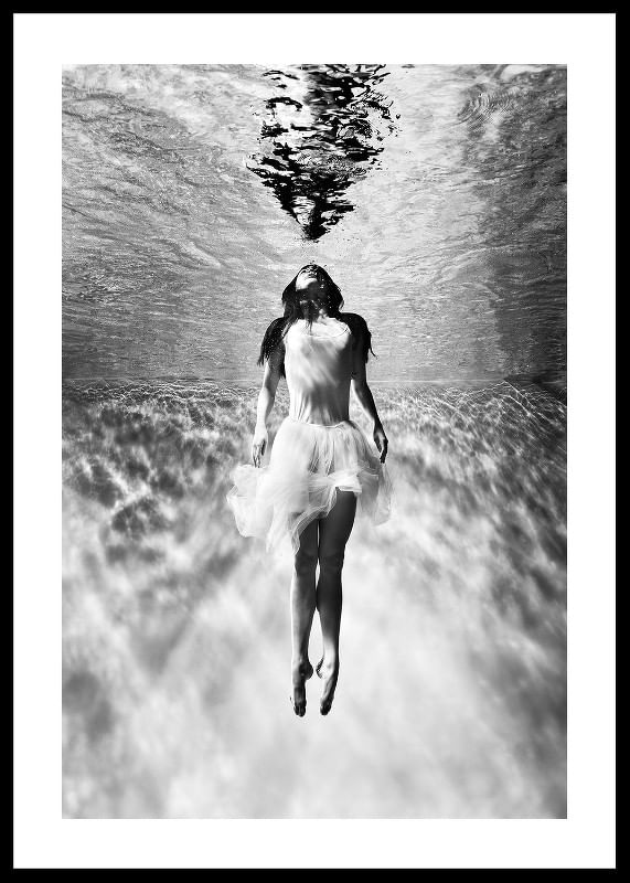 Motivet består av en kvinna klädd i en ljus klänning som svävar uppåt under vattenytan, med ljuset som bryts och reflekteras från ytan ovanför. Skuggor och rörelser i vattnet skapar ett grafiskt mönster. Den svartvita postern ger ett uttrycksfullt intryck och passar bra i moderna interiörer.