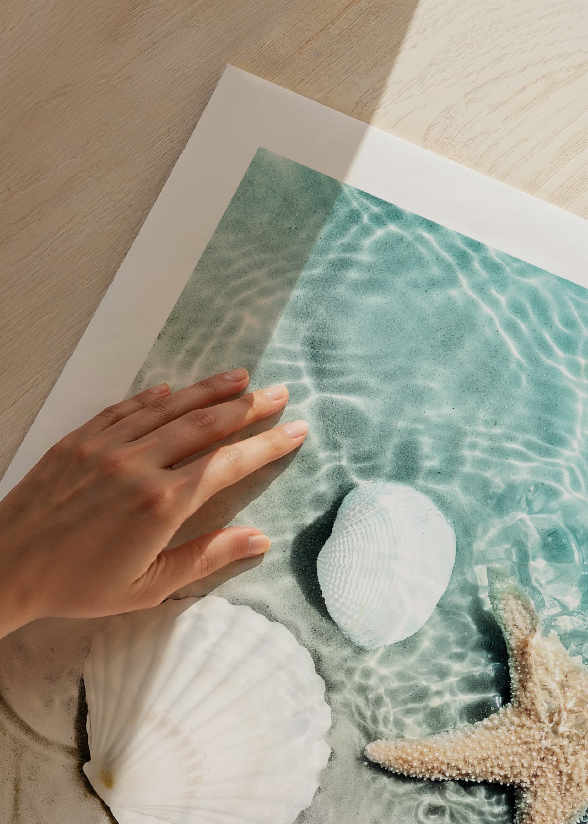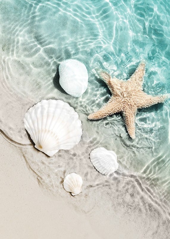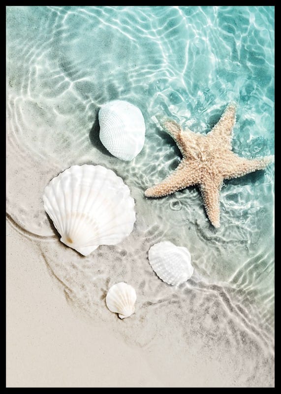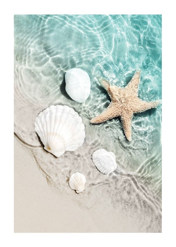 Närbild av en ljus sandstrand där vita snäckskal och en sjöstjärna ligger delvis i klart turkosblått vatten. Mjuka vågor och solens reflektioner skapar ett somrigt och avslappnat intryck. Denna poster passar utmärkt för att ge badrummet eller sovrummet en fräsch och luftig känsla med strandtema.